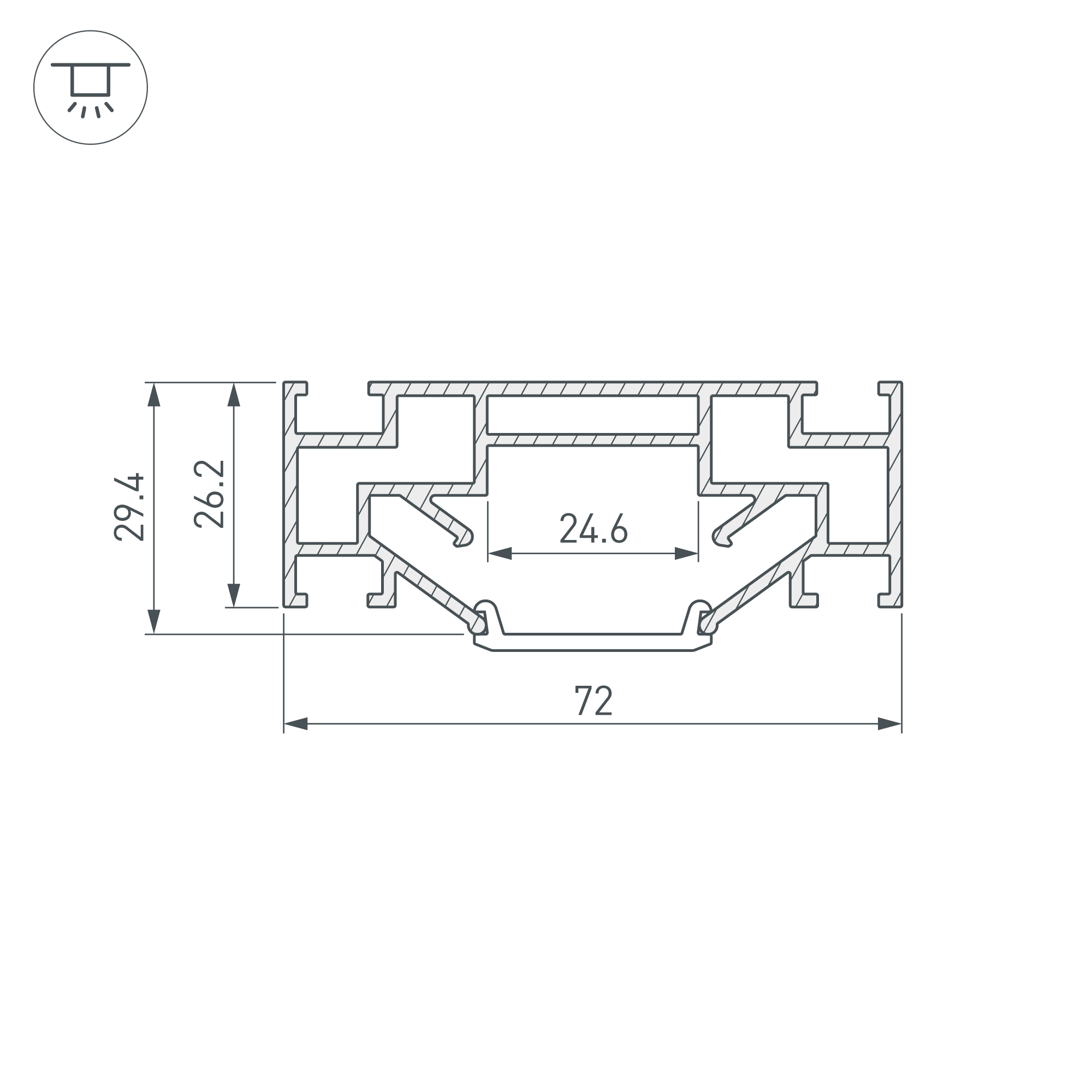 Габаритные размеры профиля составляют 2000 мм в длину, 72 мм в ширину и 29,4 мм в высоту. Площадка для установки светодиодных лент позволяет использовать ленту шириной до 24,6 мм и мощностью до 53 Вт/м. Это обеспечивает гибкость в выборе светодиодных лент и создает потрясающие световые решения.