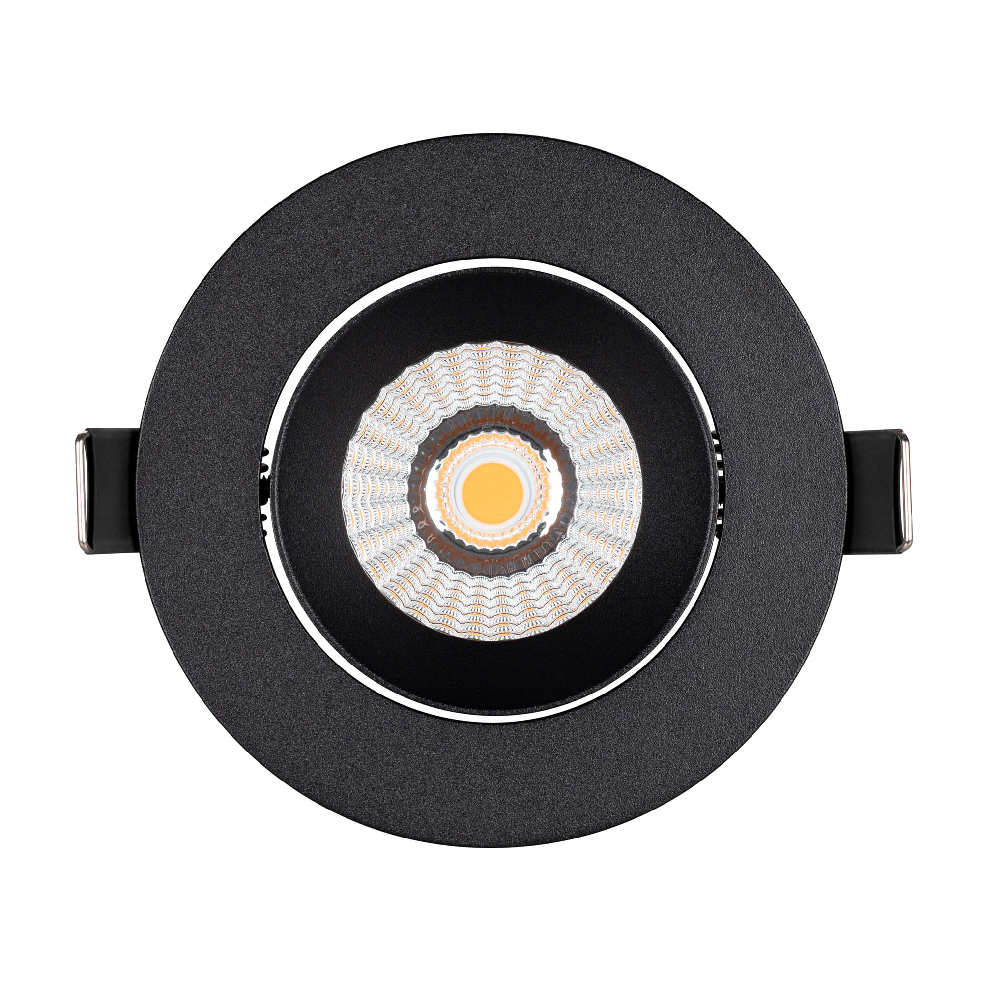 Встраиваемый поворотный светильник даунлайт. Мощность 10 Вт, св. поток 750 лм, 75 лм/Вт, тёплый 3000 K, CRI>90, угол 60°, напряжение питания 230 В. Чёрный круглый корпус из алюминия, экран PMMA, степень защиты IP54. Размер: диаметр 94 мм, высота 75 мм. Монтаж встраиваемый, установочное отверстие: диаметр 77 мм. Драйвер IP54, 20-40 В, 250 мА, пульсация <1%.