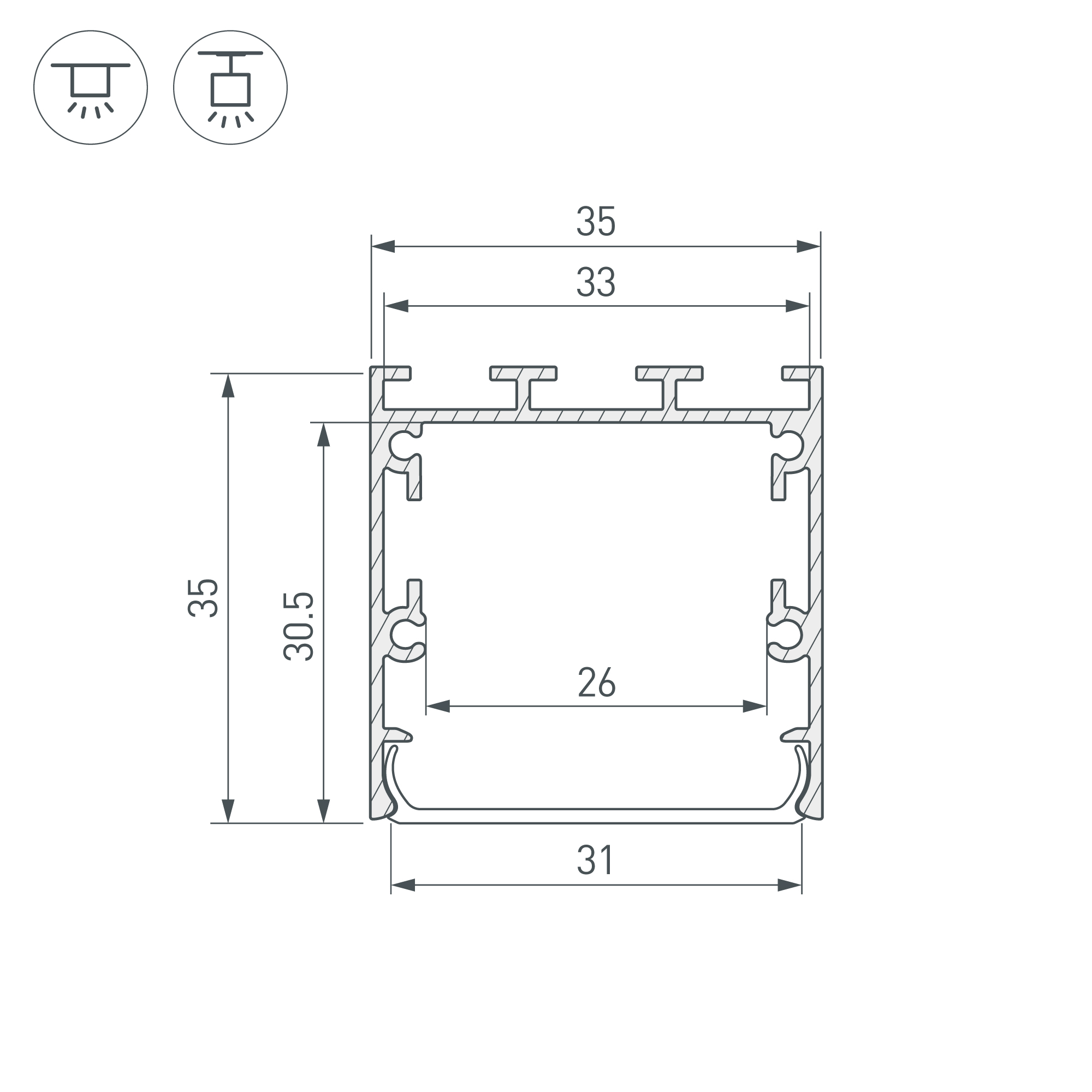 Габаритные размеры профиля составляют 2500 мм в длину, 35 мм в ширину и 35,5 мм в высоту. Площадка для установки светодиодных лент позволяет использовать ленту шириной до 26 мм и мощностью до 37 Вт/м. Это обеспечивает гибкость в выборе светодиодных лент и создает потрясающие световые решения.