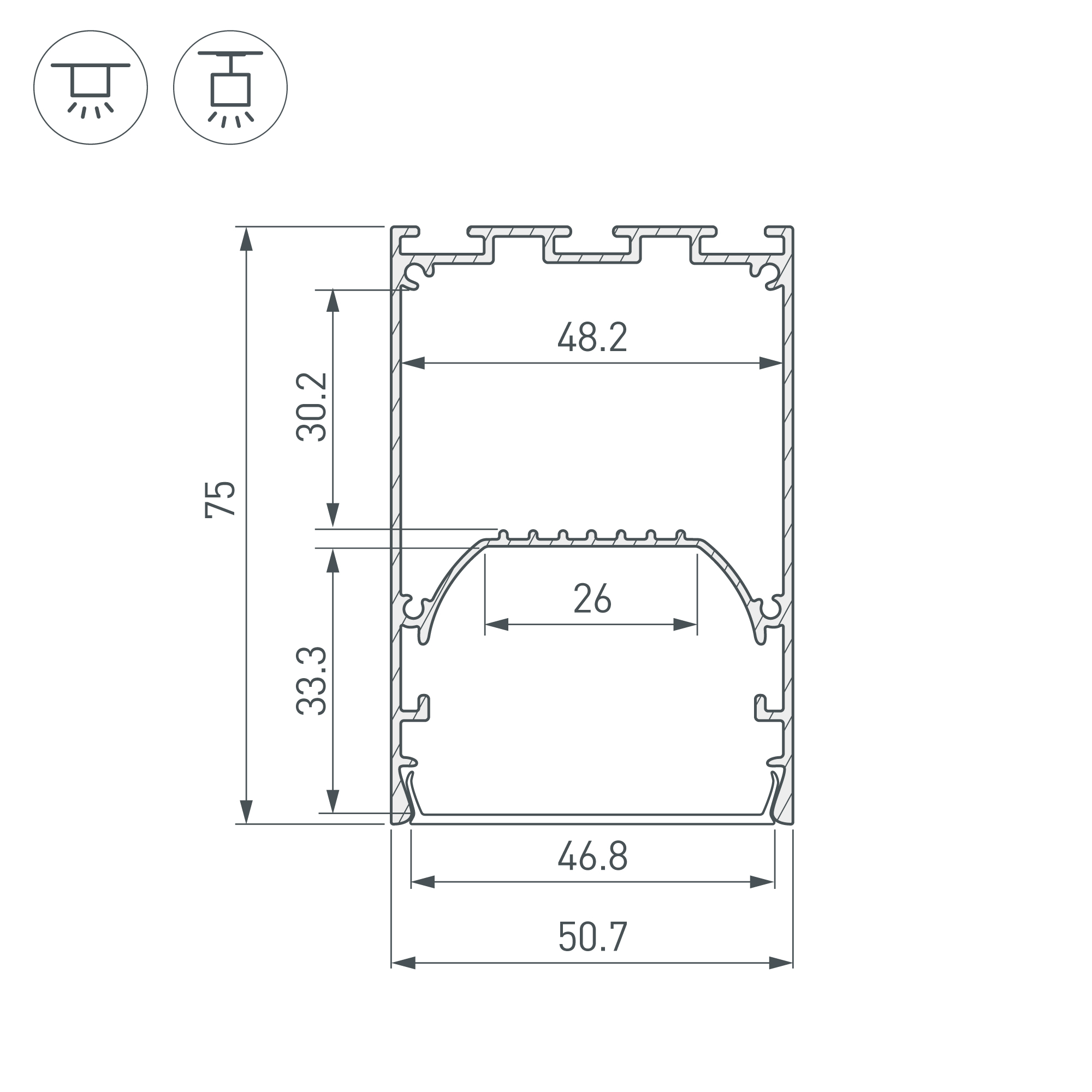 Габаритные размеры профиля составляют 2500 мм в длину, 50,7 мм в ширину и 75 мм в высоту. Площадка для установки светодиодных лент позволяет использовать ленту шириной до 26 мм и мощностью до 65 Вт/м. Это обеспечивает гибкость в выборе светодиодных лент и создает потрясающие световые решения.