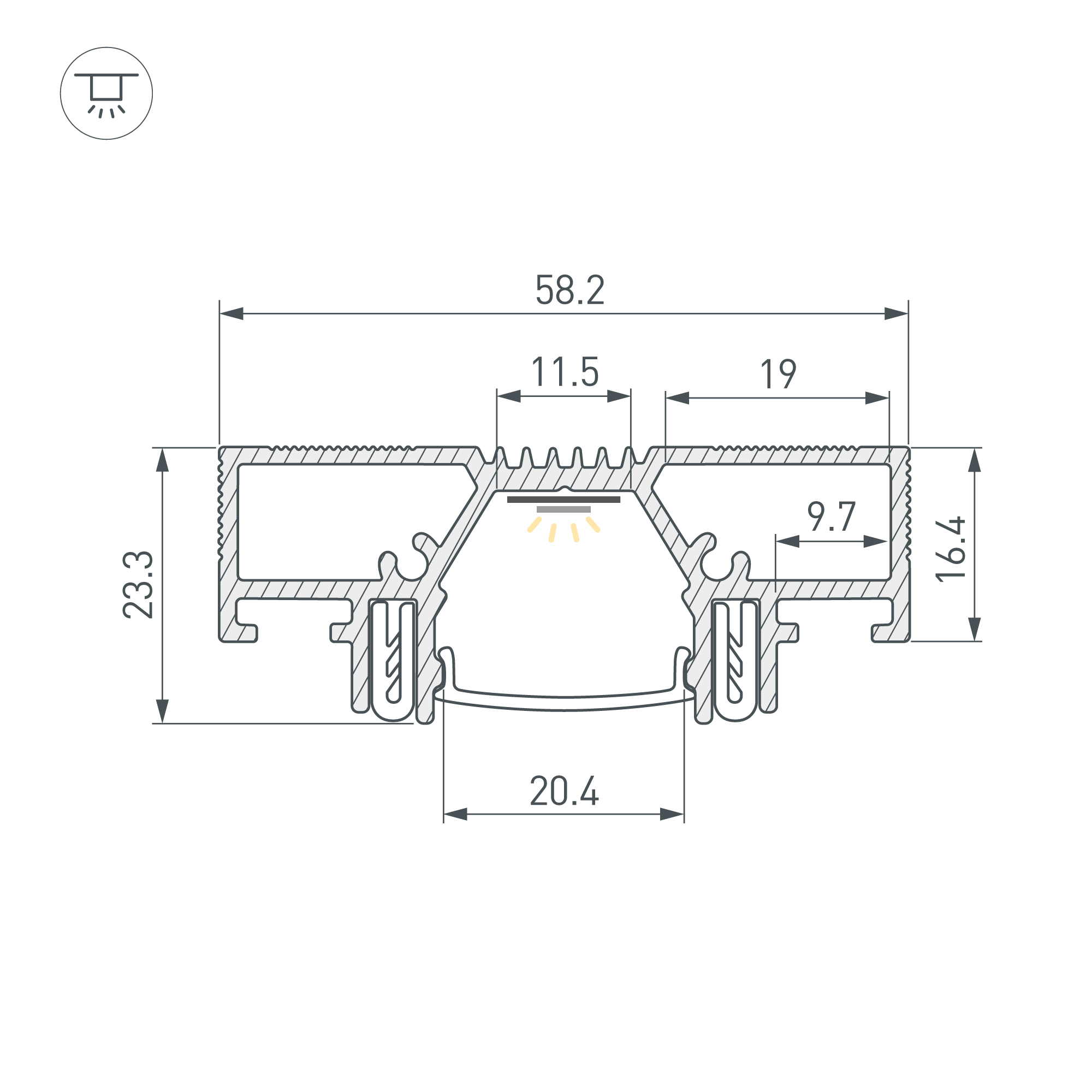 Габаритные размеры профиля составляют 2000 мм в длину, 58,2 мм в ширину и 23,35 мм в высоту. Основная площадка для установки светодиодных лент шириной до 11,5 мм и две дополнительные площадки шириной по 10мм. Это обеспечивает гибкость в выборе светодиодных лент и создает потрясающие световые решения.