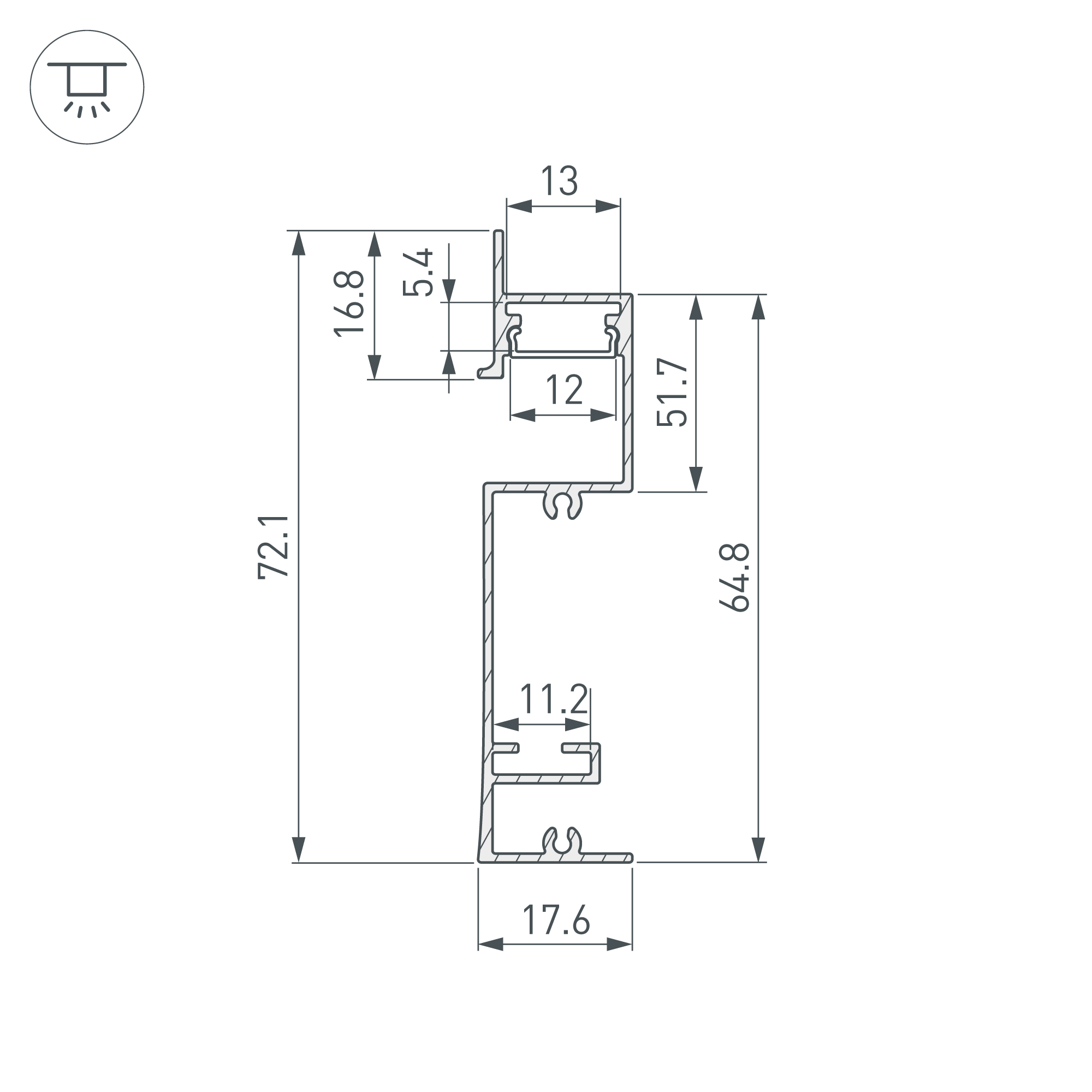 Габаритные размеры профиля составляют 2000 мм в длину, 17,6 мм в ширину и 72,1 мм в высоту. Площадка для установки светодиодных лент позволяет использовать ленту шириной до 12 мм и мощностью до 32 Вт/м. Это обеспечивает гибкость в выборе светодиодных лент и создает потрясающие световые решения.