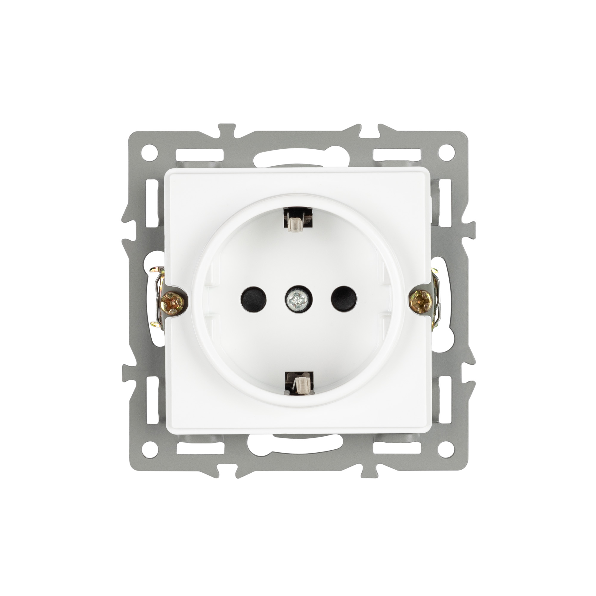 Механизм розетки с заземлением на 1 пост, с суппортом из алюминия. Цвет - белый. Степень пылевлагозащиты - IP20.