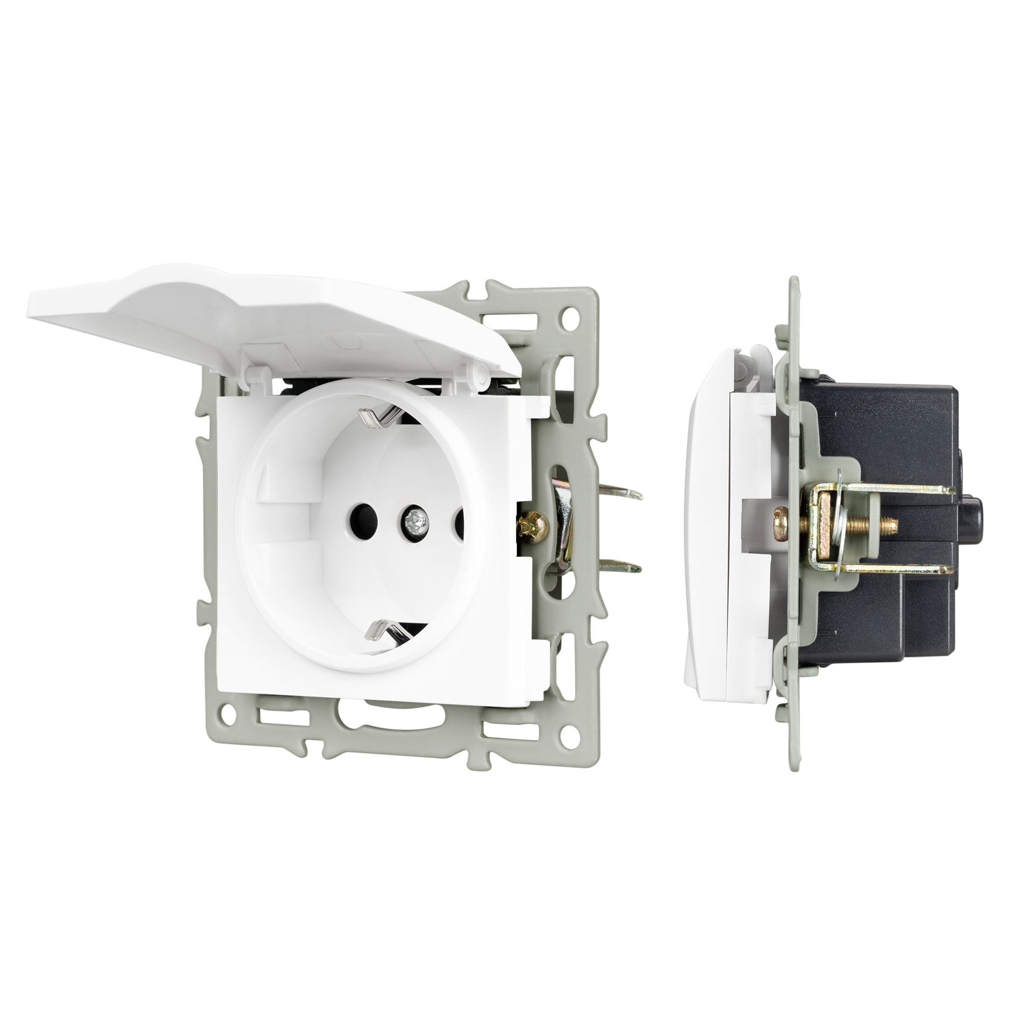 Механизм розетки с заземлением на 1 пост с влагозащитной крышкой, совместим с рамками серий VERSA/GLARE/PRESTO. Накладной тип монтажа позволяет с легкостью произвести монтаж/замену. Видимая часть механизма выполнена из высококачественного тугоплавкого пластика белого цвета. Контактная часть присоединяется при помощи винтовых зажимов, а усиленные монтажные лапки надежно фиксируют механизм в установочном подрозетнике. Степень защиты IP44 допускает использование устройства во влажных помещениях, с вероятностью прямого попадания влаги, с соблюдением требований эксплуатации.