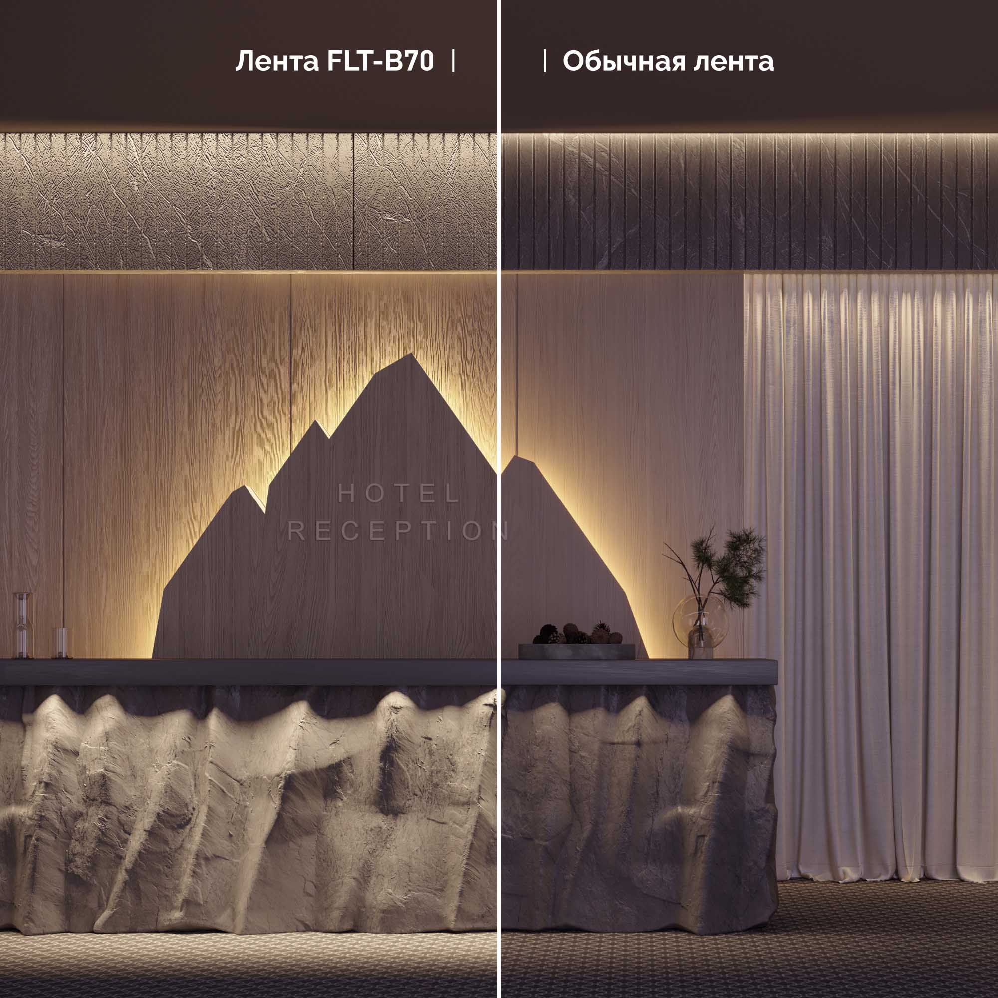 Светодиодная лента WallWasher серии B70 шириной 8 мм, мощностью 15.5 Вт/м. Светодиоды 5060, цвет свечения теплый (2700K), напряжение питания 24 В. Высокий индекс цветопередачи CRI>90 обеспечивает точное восприятие цветов при освещении любых поверхностей, направленная линза с углом 45°. Минимальный отрезок 100 мм, 7 светодиодов. Применяется для заливающей подсветки стен, создание рекламных вывесок, оформления витрин, акцентное освещение ниш.