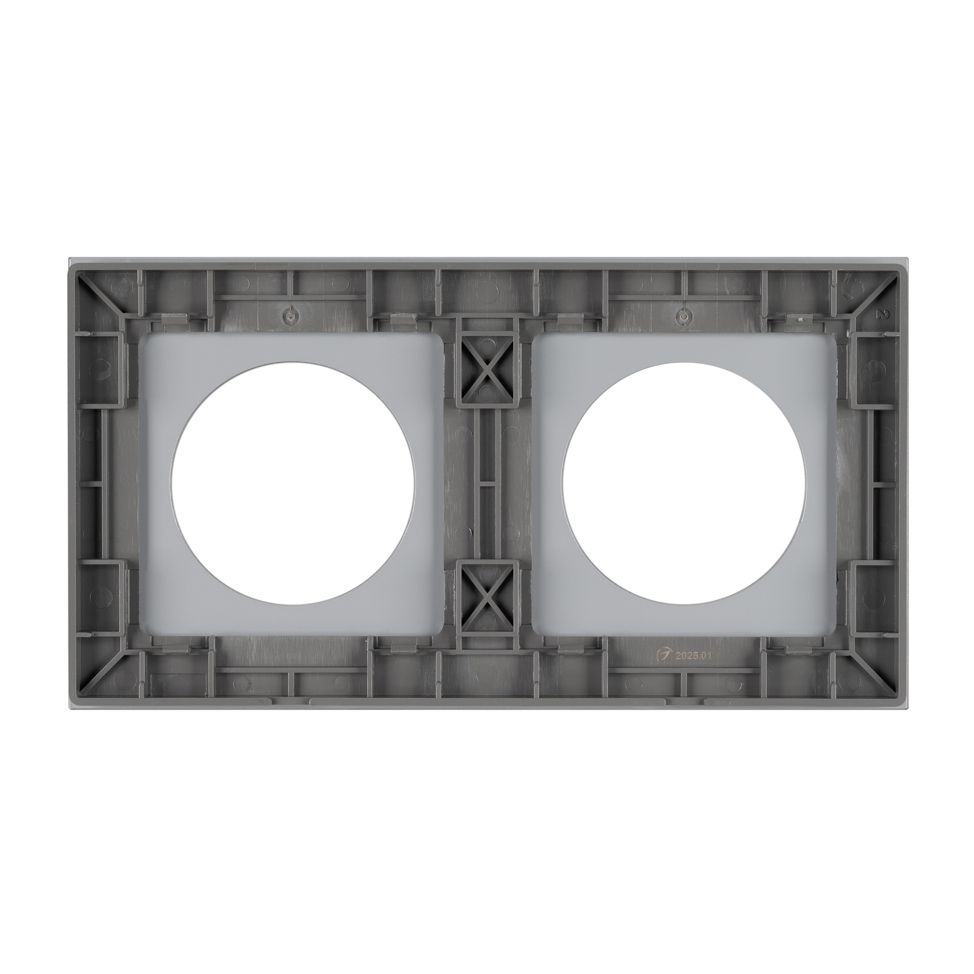Рамка стеклянная на 2 поста, под встраиваемый механизм. Вырез под функциональную часть круг. Цвет - серый. Ориентации монтажа - горизонтальная.