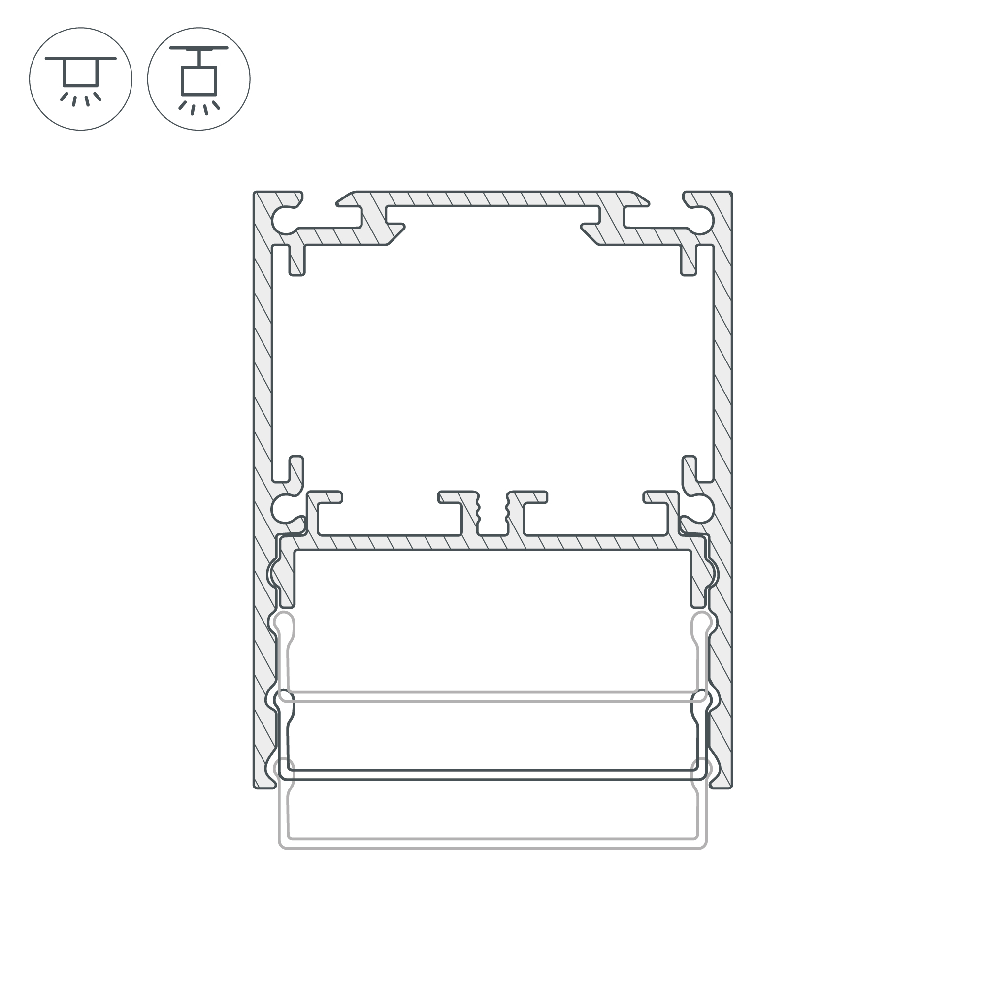 Подвесной/накладной профиль черного цвета из анодированного алюминия для основного освещения и контурной подсветки. Возможность установки экрана на трех уровнях: выступая за края профиля, вровень с профилем и утоплено, позволяет получить разные световые эффекты.
