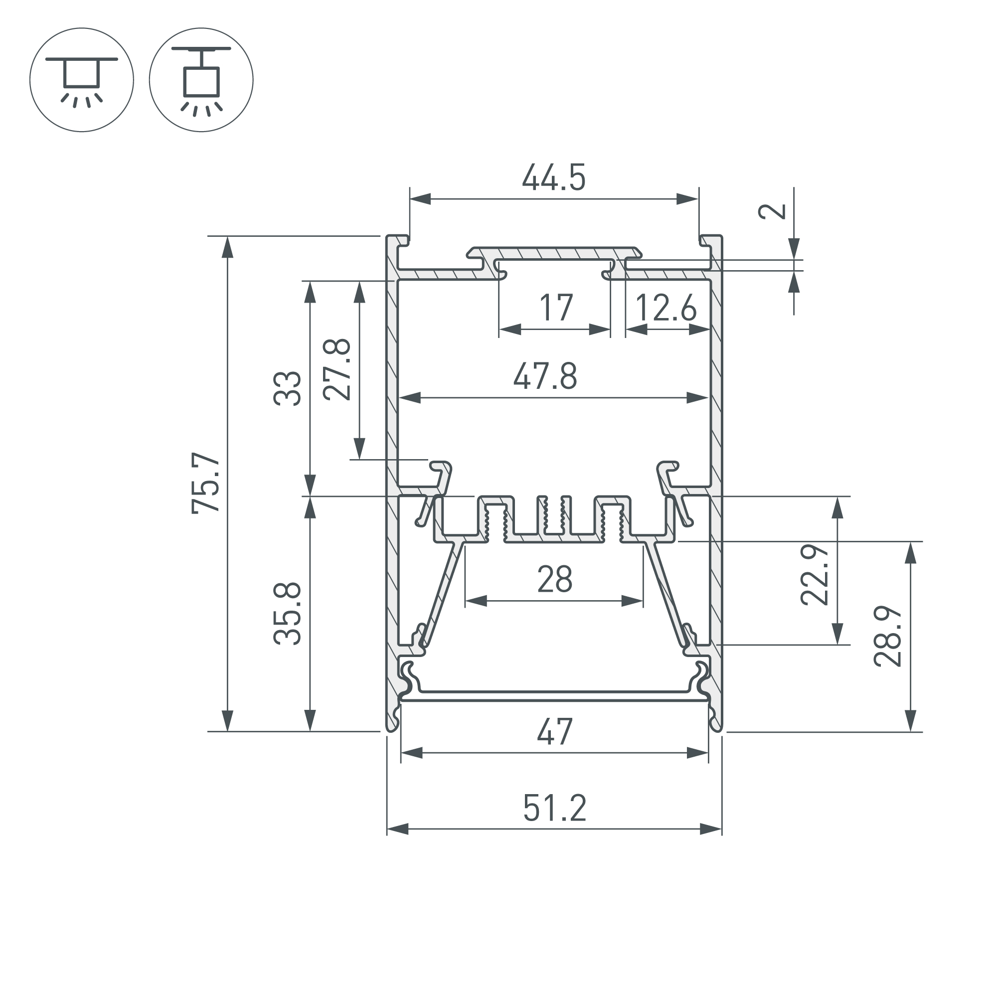 Алюминиевый накладной профиль для светодиодных лент и линеек. Цвет - черный RAL9005 (порошковая окраска). Габаритные размеры (L×W×H): 2000x51,2x75,7 мм. Ширина площадки для ленты 28 мм. Отсек для БП 47,8х27,8 мм. Экраны, заглушки и другие аксессуары приобретаются отдельно. Цена за 1 метр.
