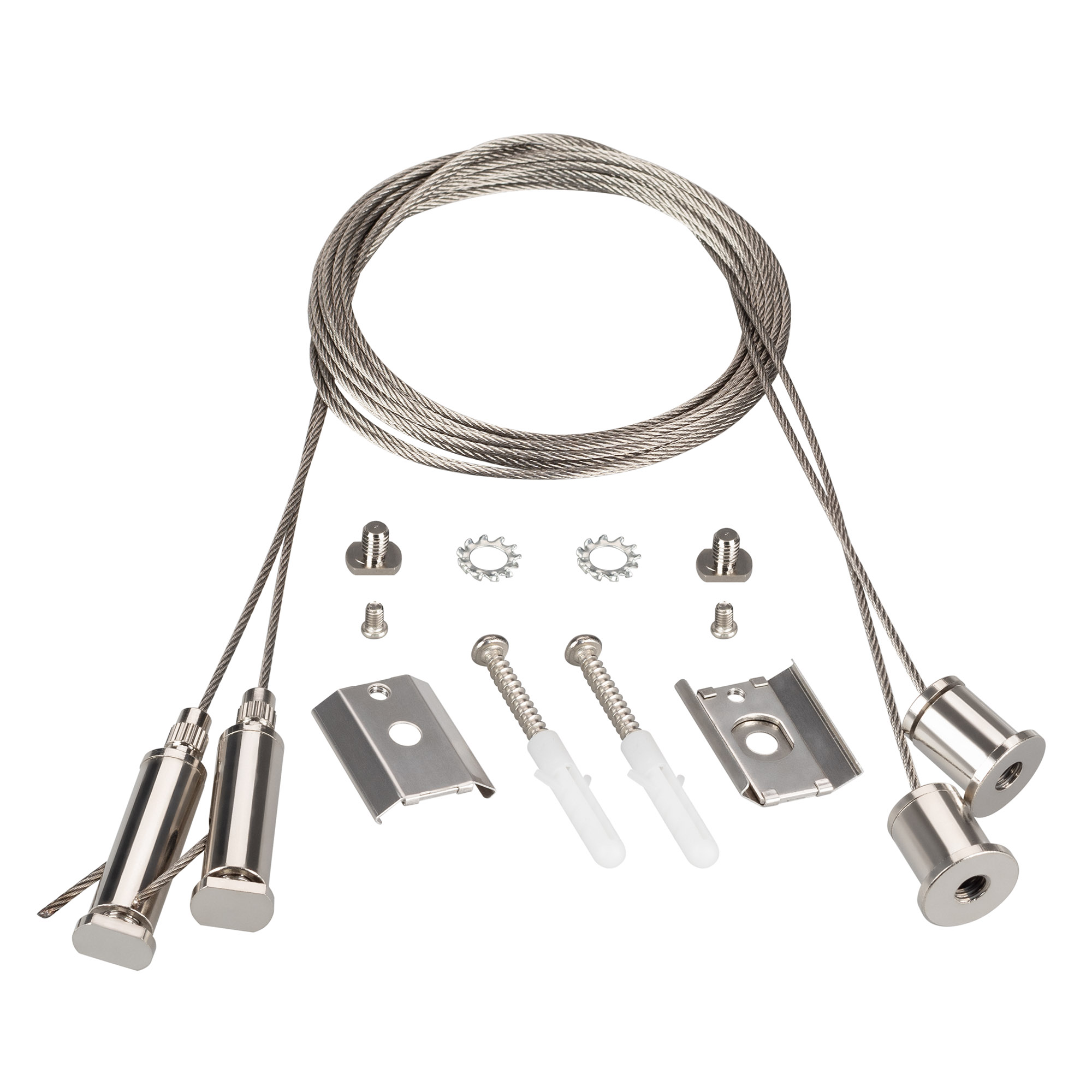 Подвесное крепление для профиля LINE-5075-HONEYCOMB. Два регулируемых троса длиной 2 метра с держателями. Используя необходимое количество тросов (в зависимости от формы и длины светильника) можно легко зафиксировать конструкцию на необходимом расстоянии от потолка.