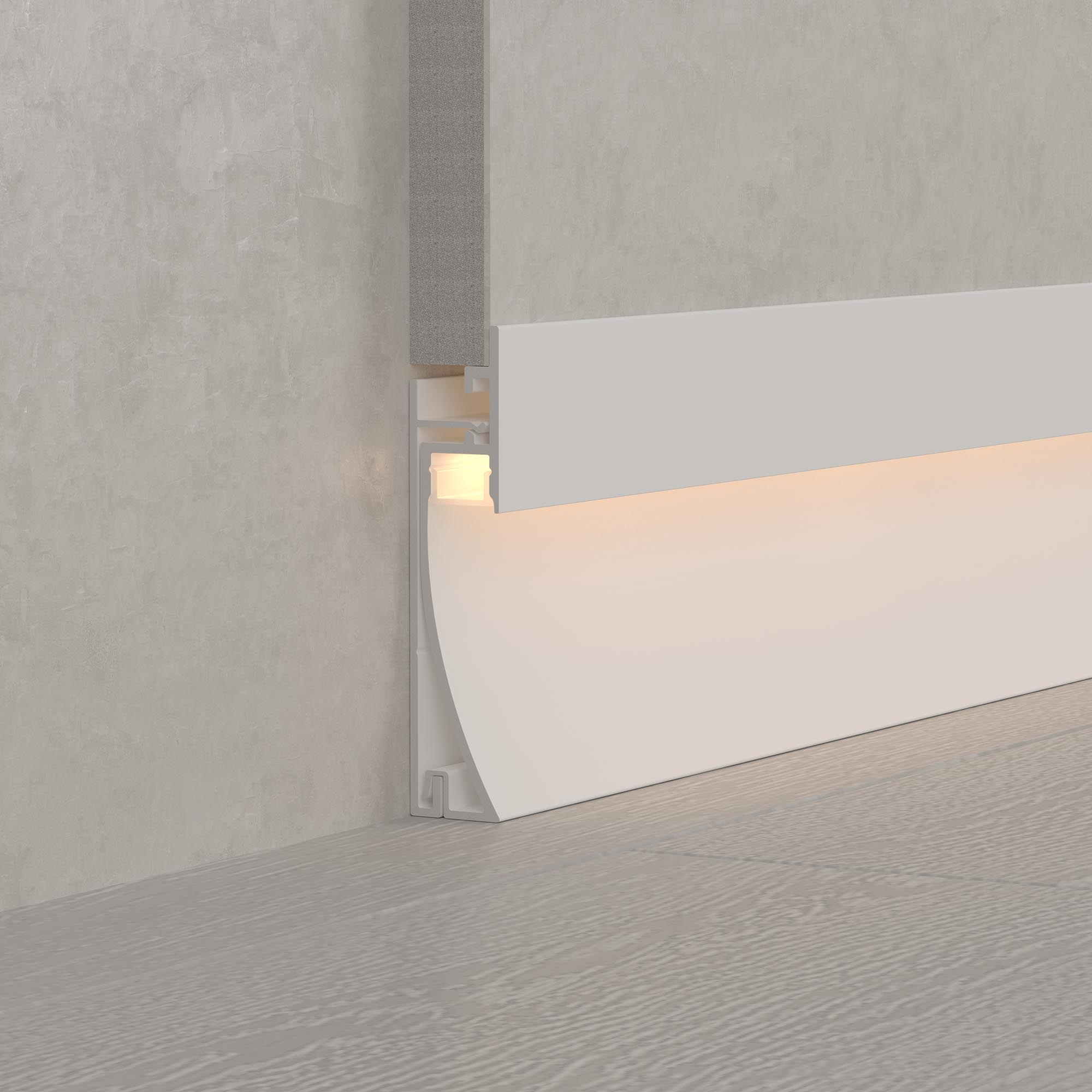 Встраиваемый двухкомпонентный алюминиевый профиль-плинтус с накладным фланцем белого цвета для создания эффекта парящей стены. Габаритные размеры профиля составляют 2000 мм в длину, 12,2 мм в ширину и 58,3 мм в высоту. Площадка для установки светодиодных лент позволяет использовать ленту шириной до 8 мм и мощностью до 20 Вт/м. Это обеспечивает гибкость в выборе светодиодных лент и создает потрясающие световые решения. Экран, заглушки и другие аксессуары не включены в комплект и приобретаются отдельно. Цена указана за 1 метр профиля. Отличное решение для создания современных световых проектов.