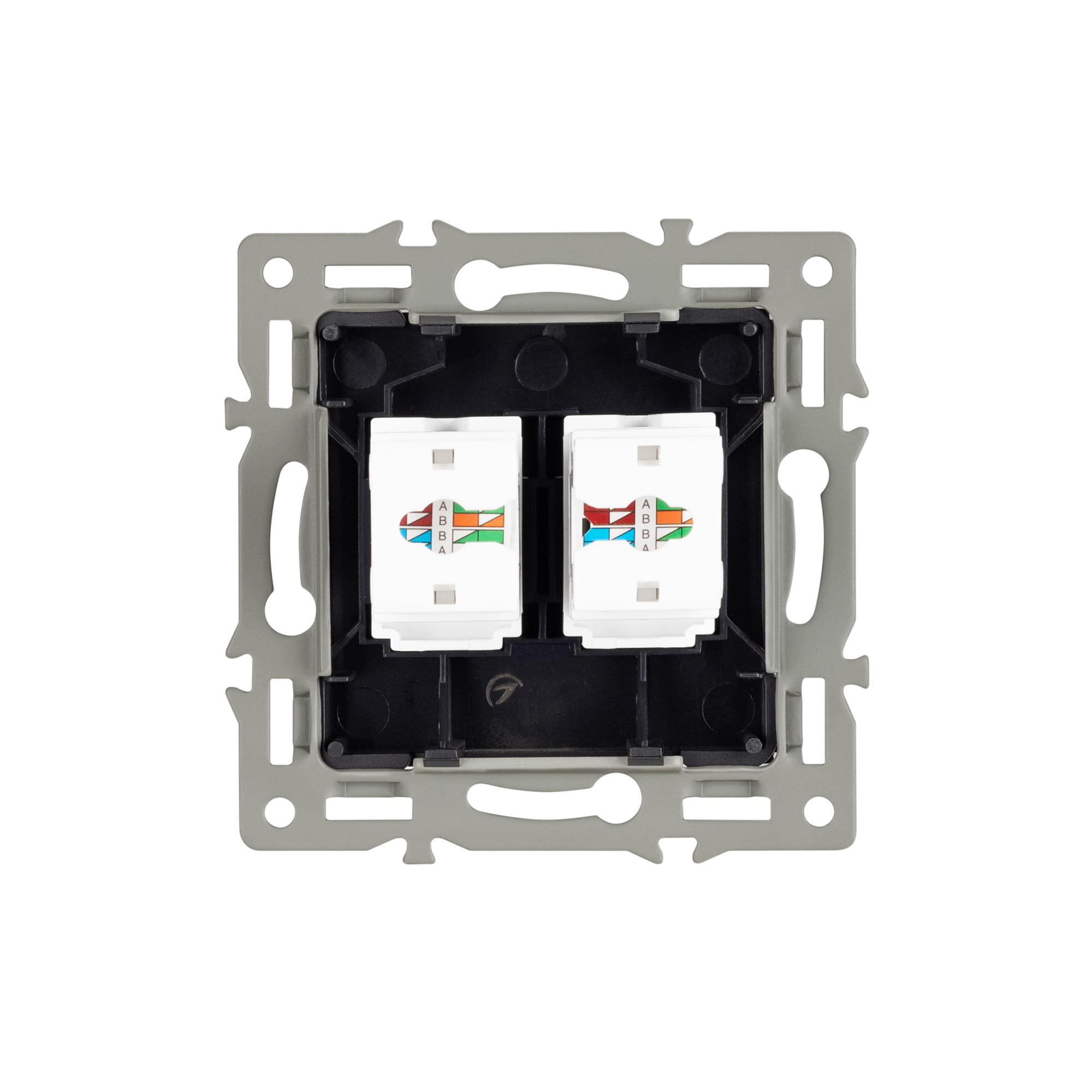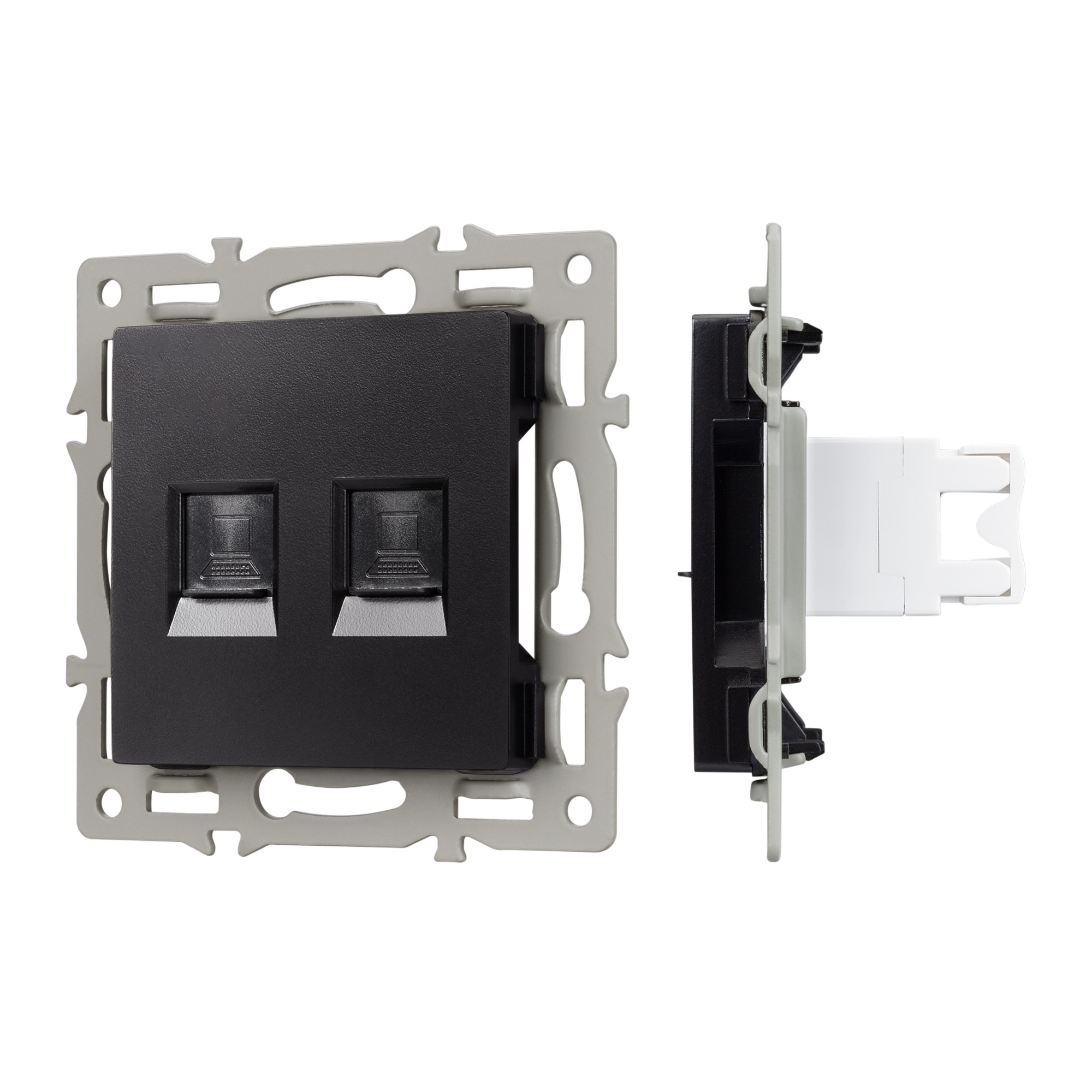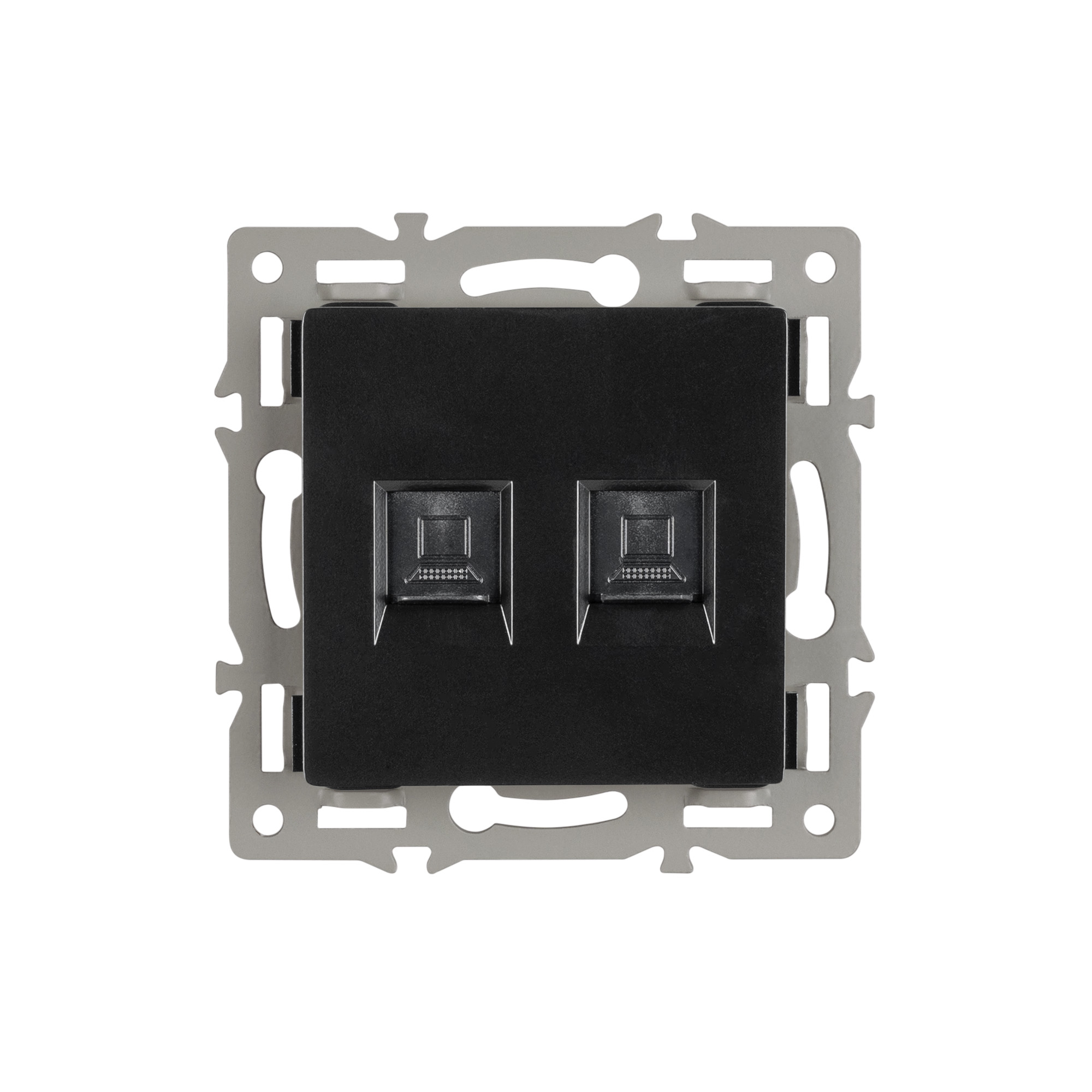 Механизм компьютерной розетки на 1 пост 2 слота 6-й категории (CAT6), с суппортом из алюминия. Цвет - черный. Степень пылевлагозащиты - IP20.
