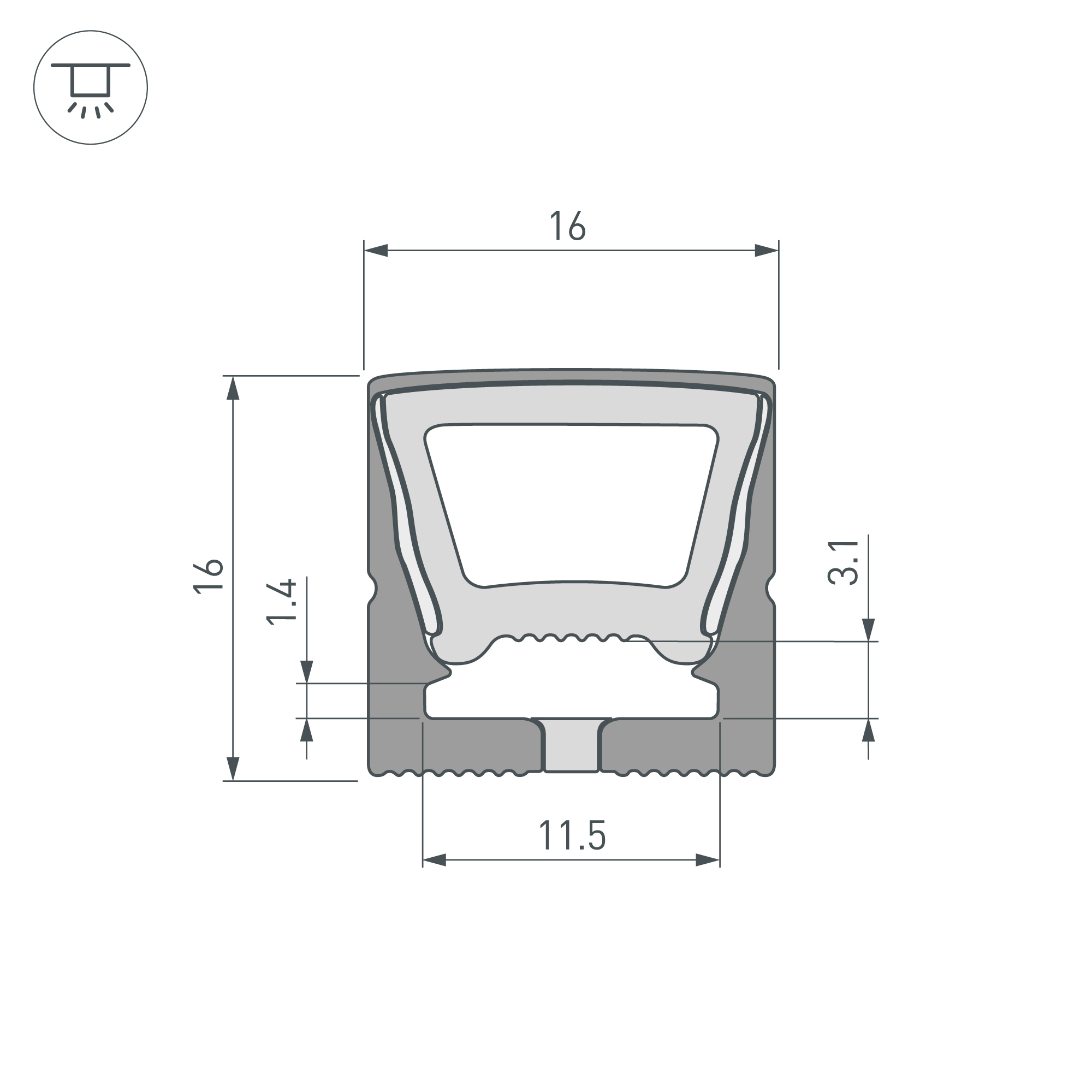 Цельнолитой силиконовый гибкий профиль черного цвета с УФ-защитой. Габаритные размеры профиля составляют 5000 мм в длину, 16 мм в ширину и 16 мм в высоту. Вертикальный изгиб TOP, минимальный радиус изгиба 60 мм. Угол излучения 110°. Для удобства установки ленты по всей длине профиля протянута нить. Площадка для установки светодиодных лент позволяет использовать ленту шириной до 10 мм, высотой до 2,85 мм и мощностью до 10 Вт/м. Это обеспечивает гибкость в выборе светодиодных лент и создает потрясающие световые решения. Для установки во влажных помещениях необходима герметизация при помощи двухкомпонентного эпоксидного герметика. Класс пылевлагозащиты – IP65 (при соблюдении технологии герметизации). Этот продукт представляет отличное решение для создания современных световых проектов и обеспечивает надежную и стильную основу для установки светодиодов.