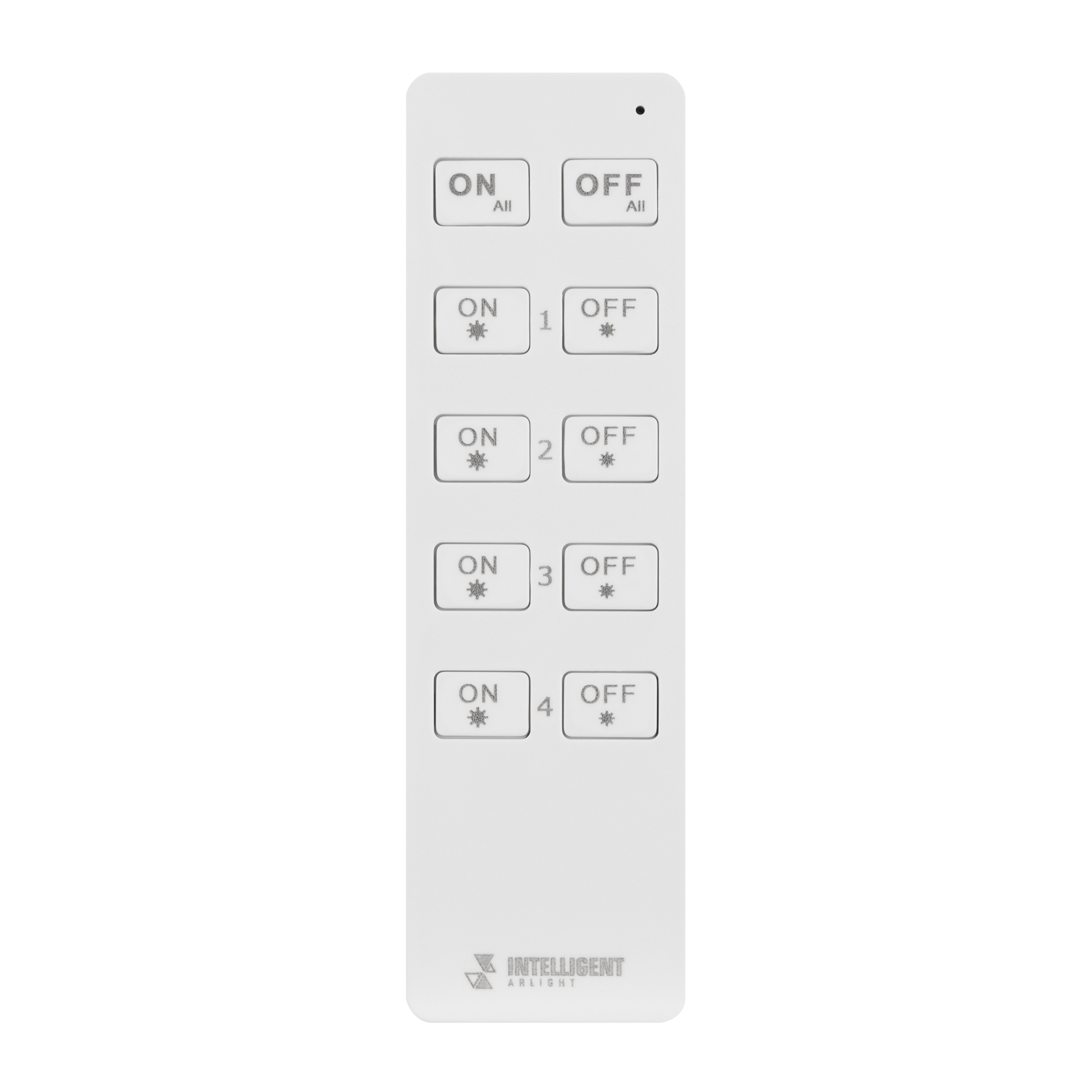 Кнопочный радиочастотный пульт белого цвета, предназначенный для управления одноцветными источниками света. Поддерживает основные функции: включение и выключение света, регулировку яркости, управление 4 световыми зонами. Устройство совместимо с диммерами и контроллерами серии SMART, поддерживающими управление по радиоканалу 2.4G. К одному пульту возможно привязать неограниченное количество диммеров и контроллеров. Питание 3В осуществляется от батарейки CR2032. Корпус пульта выполнен из пластика с покрытием Soft-Touch. Габариты устройства 135x40x11 мм.
