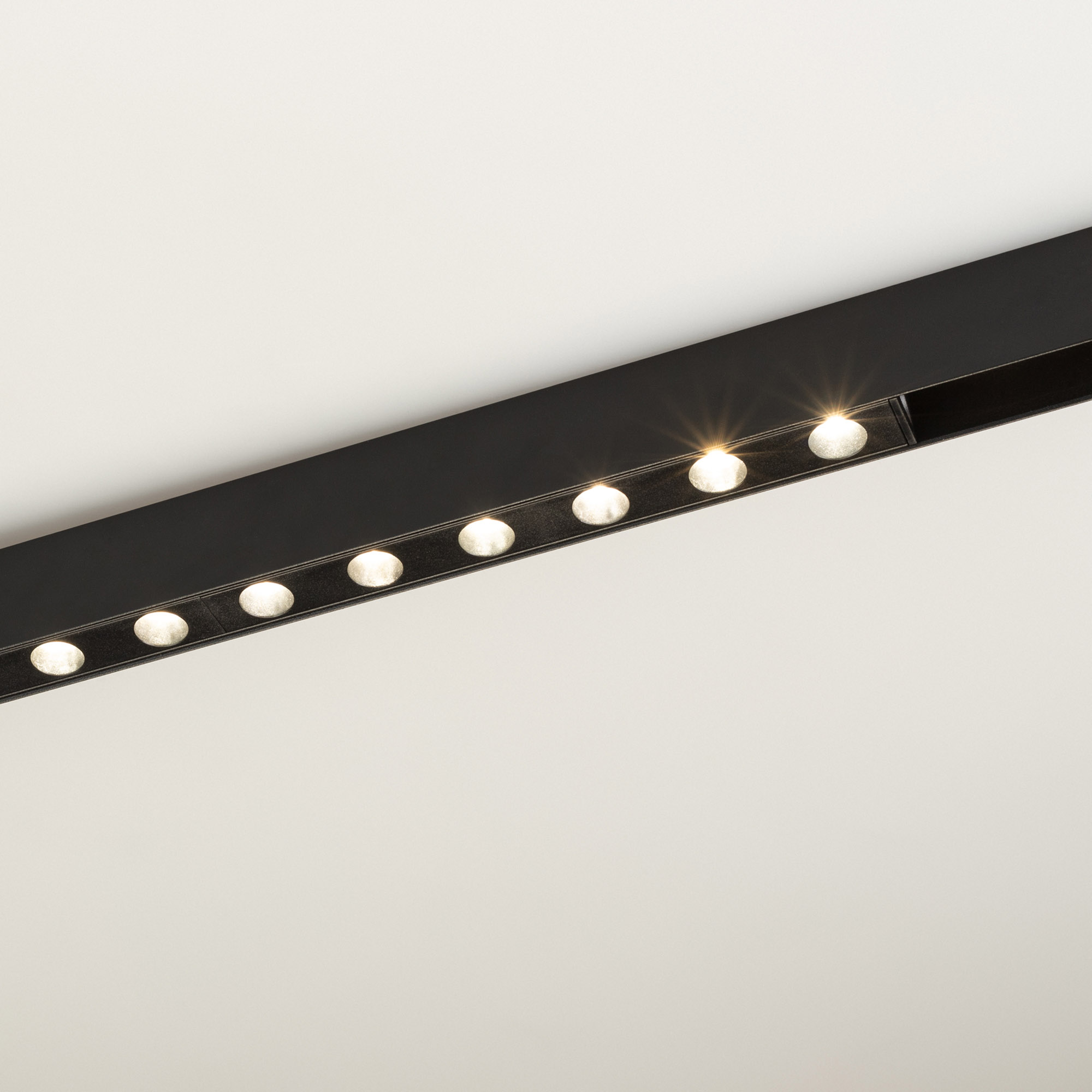 Линейный светодиодный светильник светильник MAG-DOTS-25-L400-12W Warm3000 (BK, 30 deg, 24V, DALI) мощностью 12 Вт для магнитных треков MAG-25 с управлением DALI. Светодиоды снабжены линзами, расположены в индивидуальных ячейках и обеспечивают узкий угол и тёплый белый цвет свечения (3000 К), световой поток 800 лм и высокий индекс цветопередачи CRI>90 гарантируют качественное освещение с точной передачей цветовых оттенков. Есть возможность управлять яркостью по протоколу DALI. У светильника безопасное напряжение 24 В и быстрая установка в шинопровод с помощью магнитов. Драйвер для подключения поставляется отдельно.
