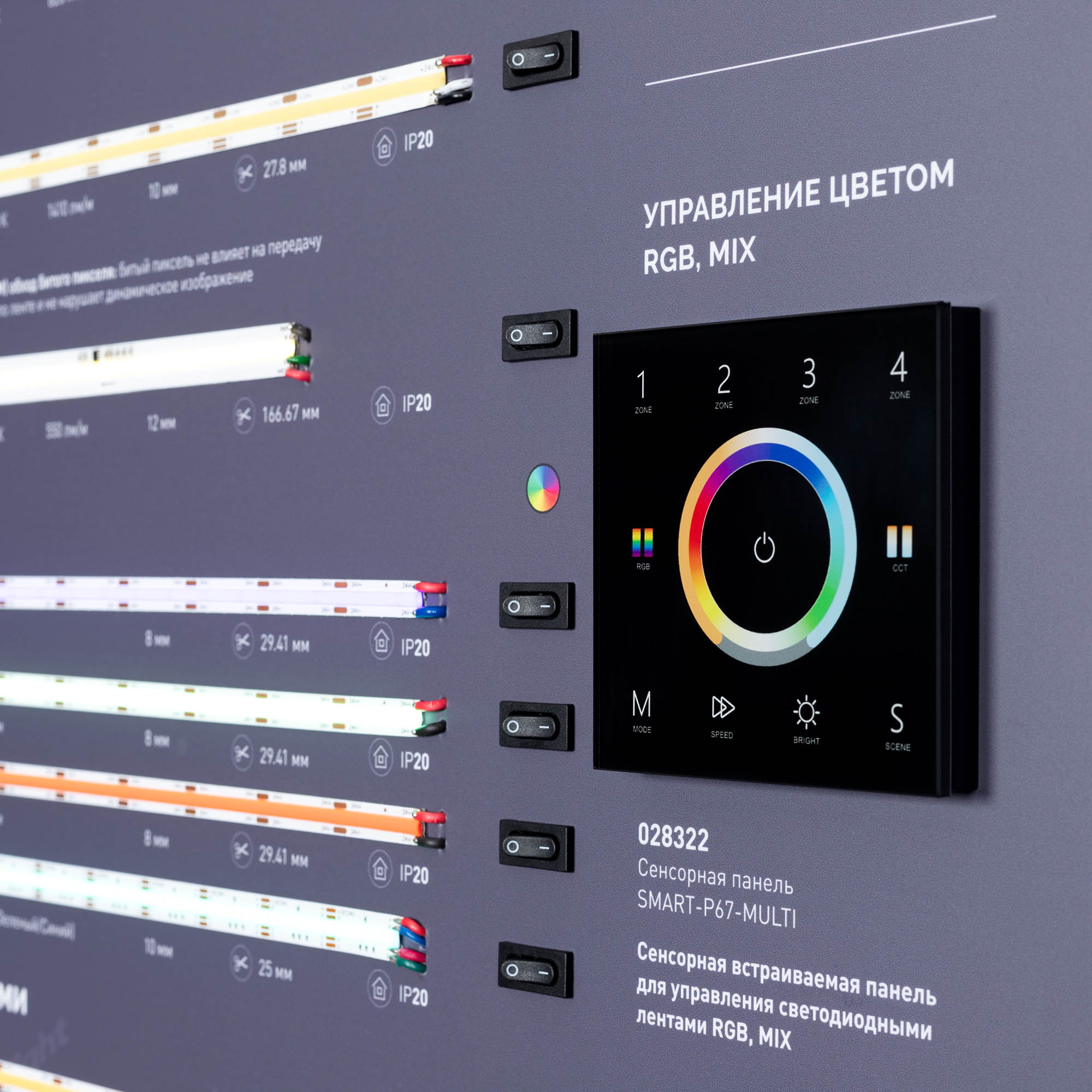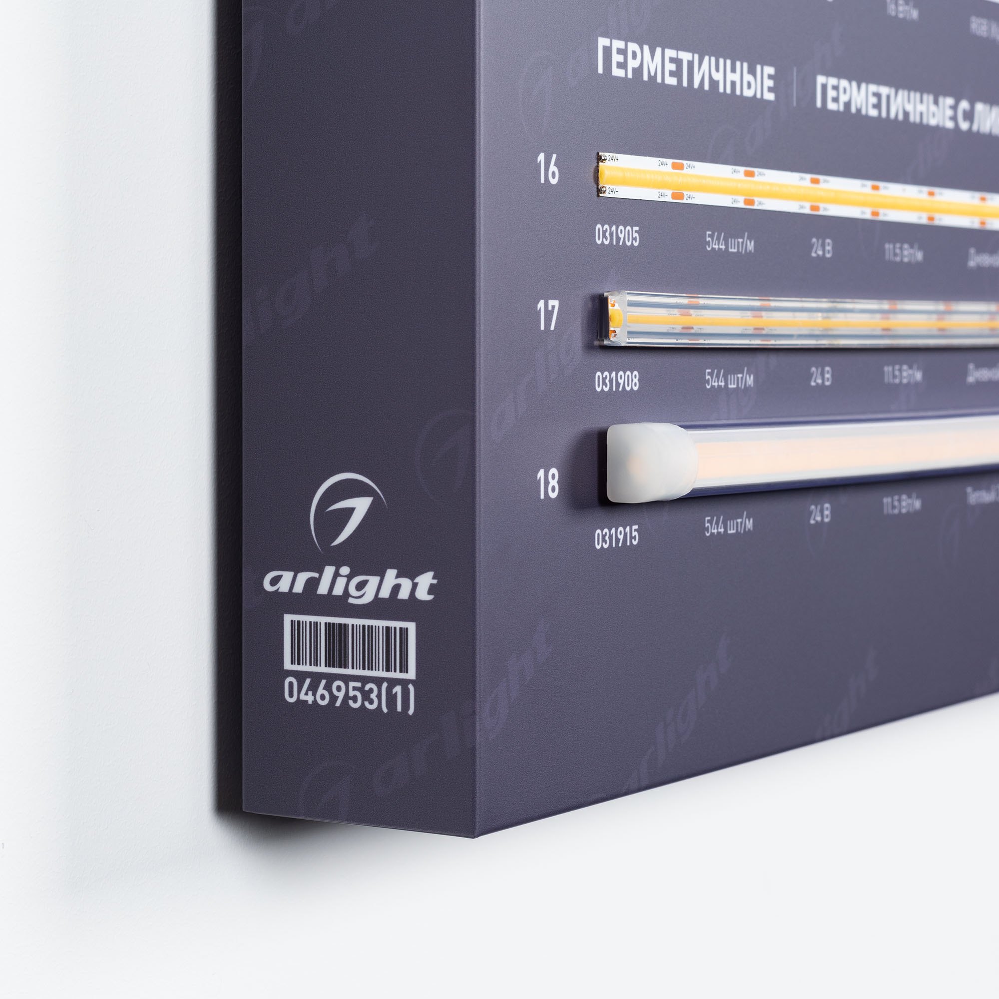 На стенде представлены ленты для создания основного и декоративного освещения: с высокой плотностью светодиодов, СОВ (без видимых светодиодов), ленты бокового свечения.