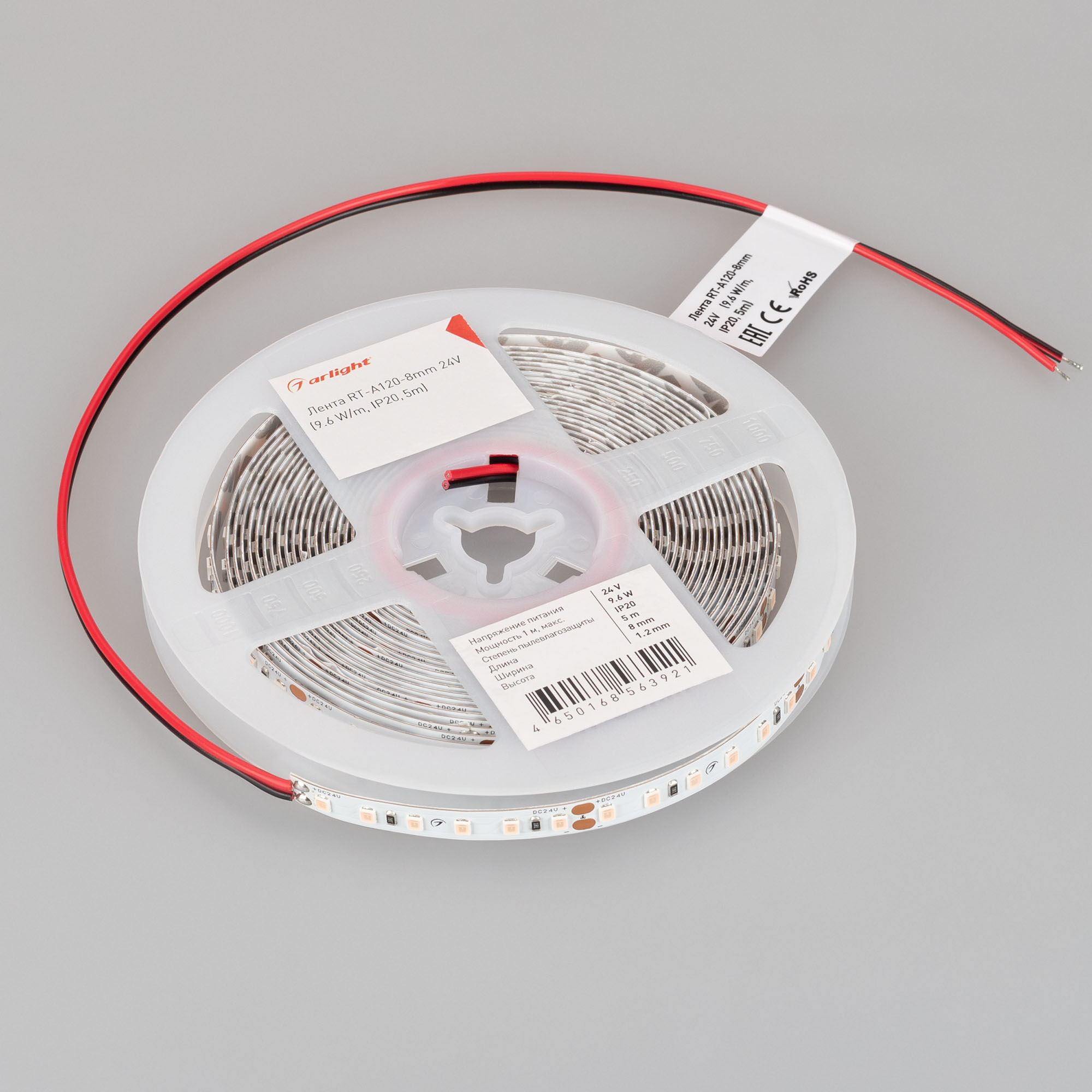 Универсальная светодиодная лента RT серии A120 шириной 8 мм, мощностью 9.6 Вт/м. Напряжение питания 24 В. Светодиоды SMD 2835, 120 шт/м, цвет свечения персиковый. Минимальный отрезок 50 мм (6 светодиодов). Универсальное применение для организации декоративной подсветки любых жилых и коммерческих помещений, подсветки интерьеров, потолочных ниш, лестниц, ступеней, полок, натяжных потолков, витражей. Создание световой рекламы: подсветка лайтбоксов, вывесок, букв, витрин. Рекомендуется установка на профиль.