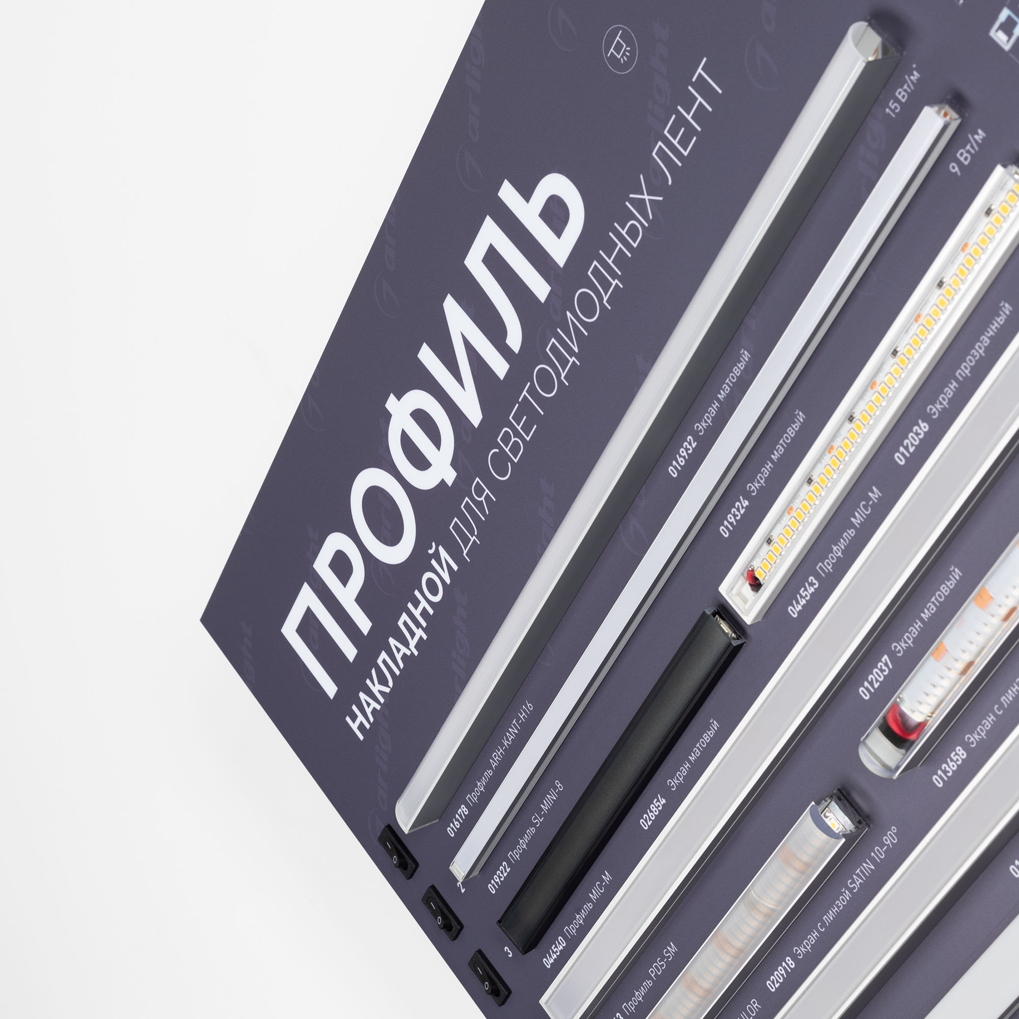 На стенде представлен ассортимент алюминиевых накладных профилей для светодиодных лент для основного и декоративного освещения.