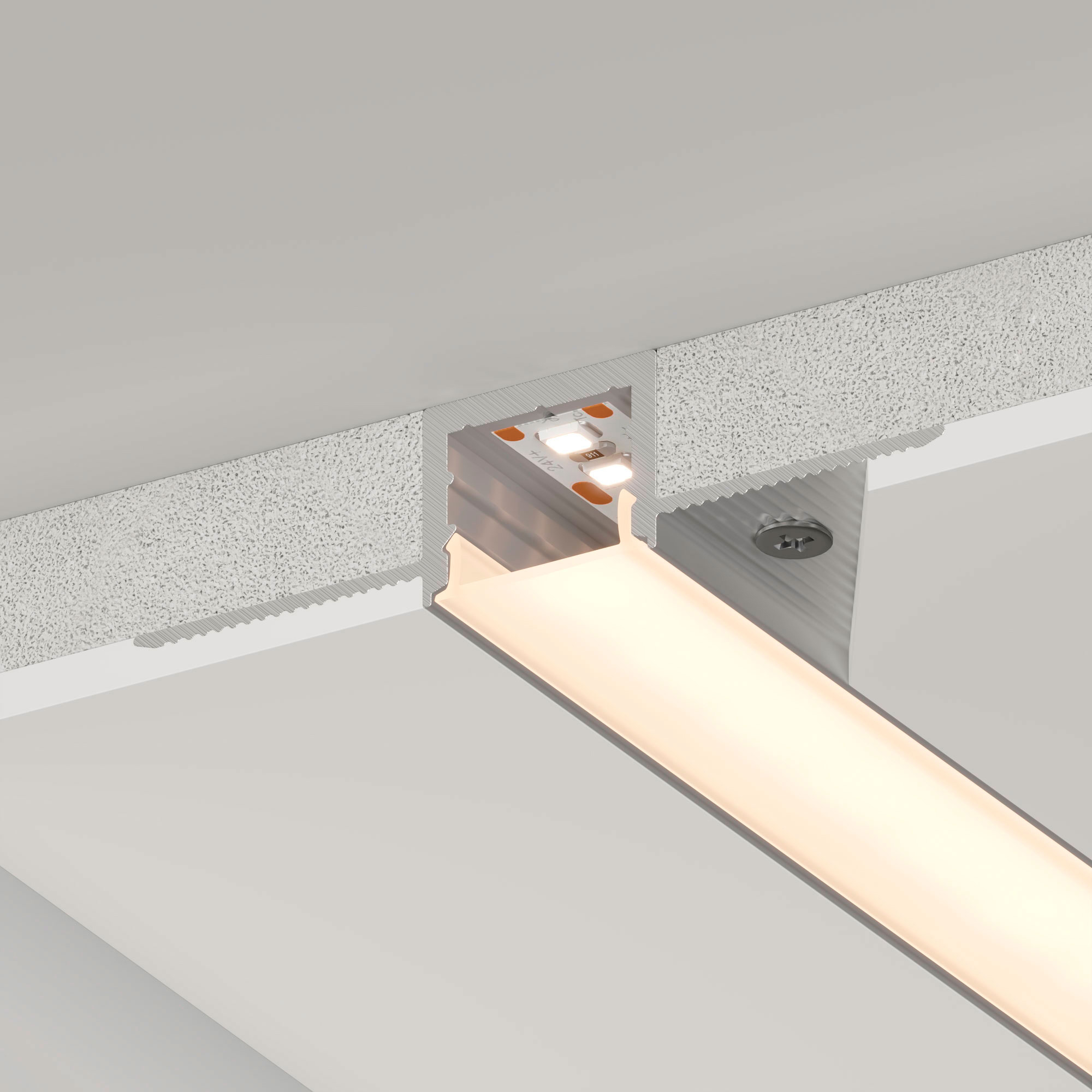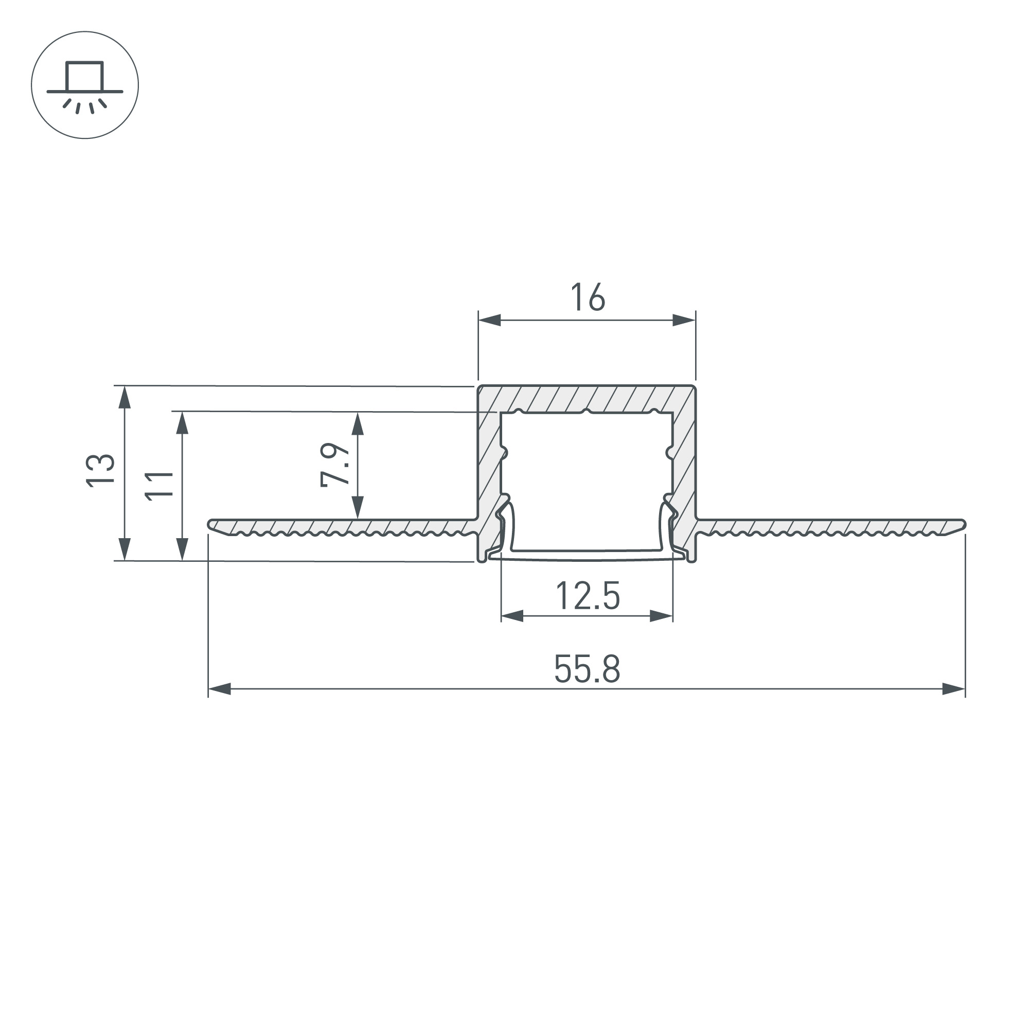 Встраиваемый профиль со скрытым фланцем из анодированного алюминия под строительную отделку для контурной подсветки интерьера. Габаритные размеры профиля составляют 2000 мм в длину, 55,8 мм в ширину и 13 мм в высоту. Площадка для установки светодиодных лент позволяет использовать ленту шириной до 12 мм и мощностью до 25,7 Вт/м. Это обеспечивает гибкость в выборе светодиодных лент и создает потрясающие световые решения.