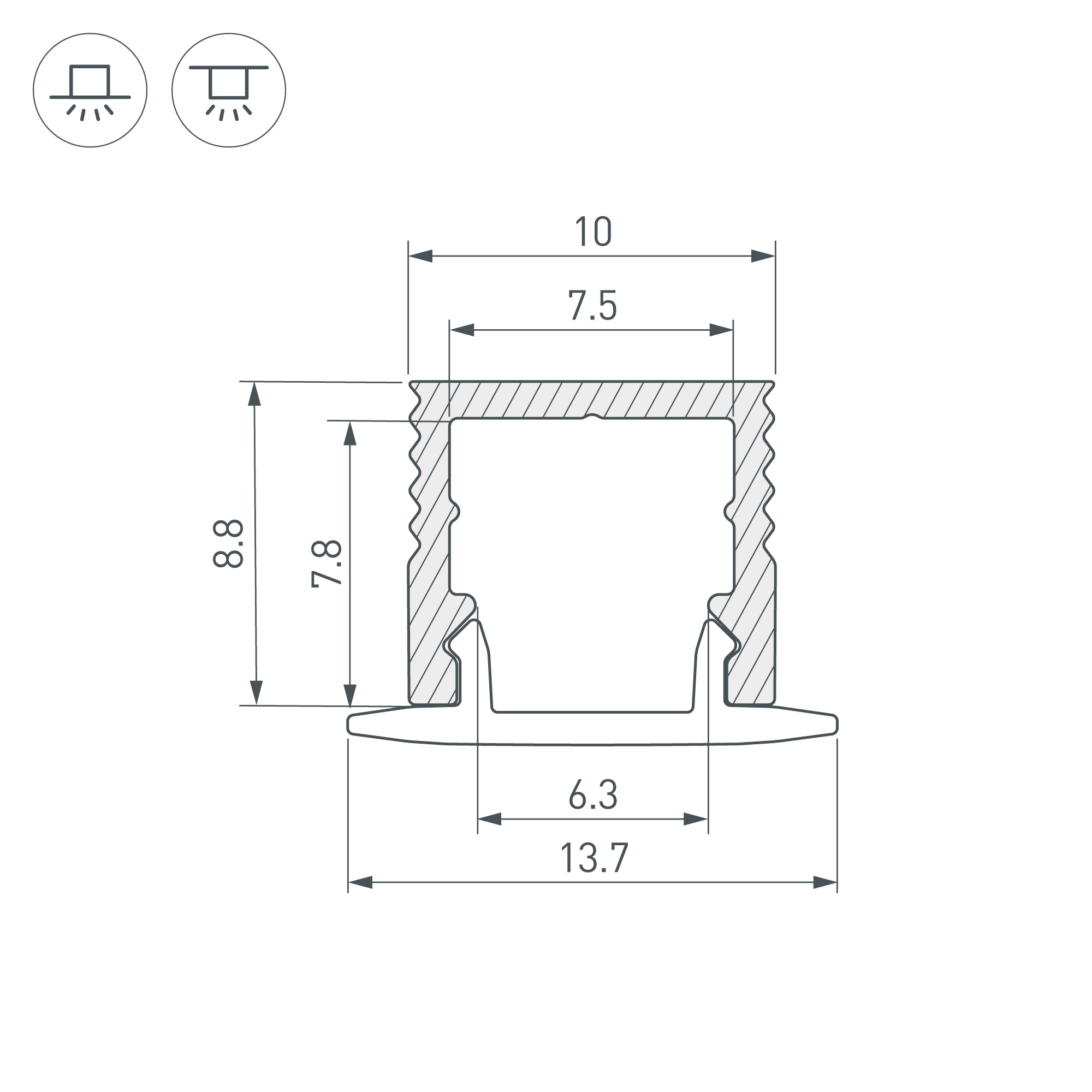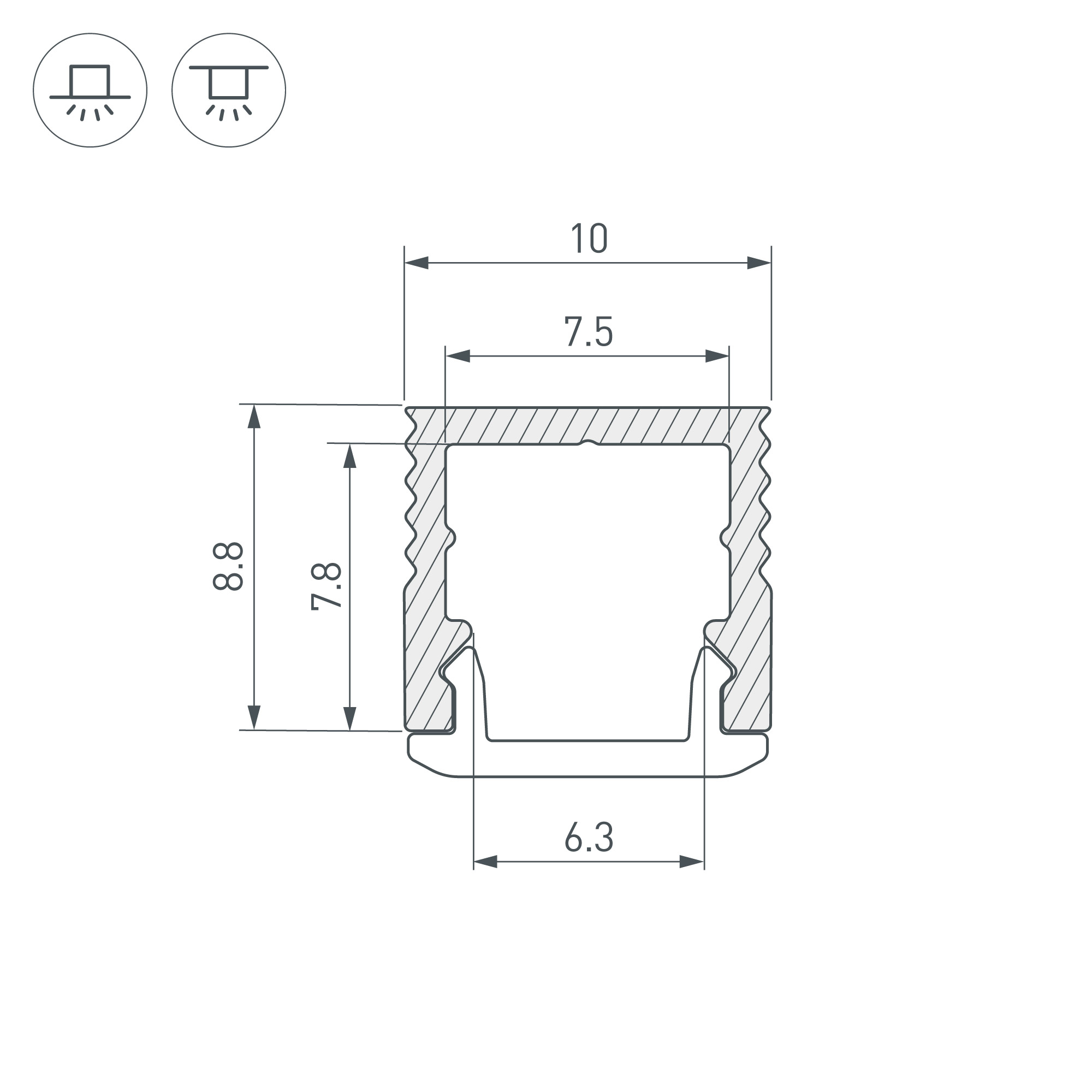 Накладной/встраиваемый микро-профиль из анодированного алюминия для подсветки мебели, пазов, ниш и других элементов интерьера. В зависимости от выбранного экрана профиль можно как установить на поверхность, так и встроить в неё. Габаритные размеры профиля составляют 2000 мм в длину, 10 мм в ширину и 8,8 мм в высоту. Площадка для установки светодиодных лент позволяет использовать ленту шириной до 7,5 мм и мощностью до 10 Вт/м. Это обеспечивает гибкость в выборе светодиодных лент и создает потрясающие световые решения.