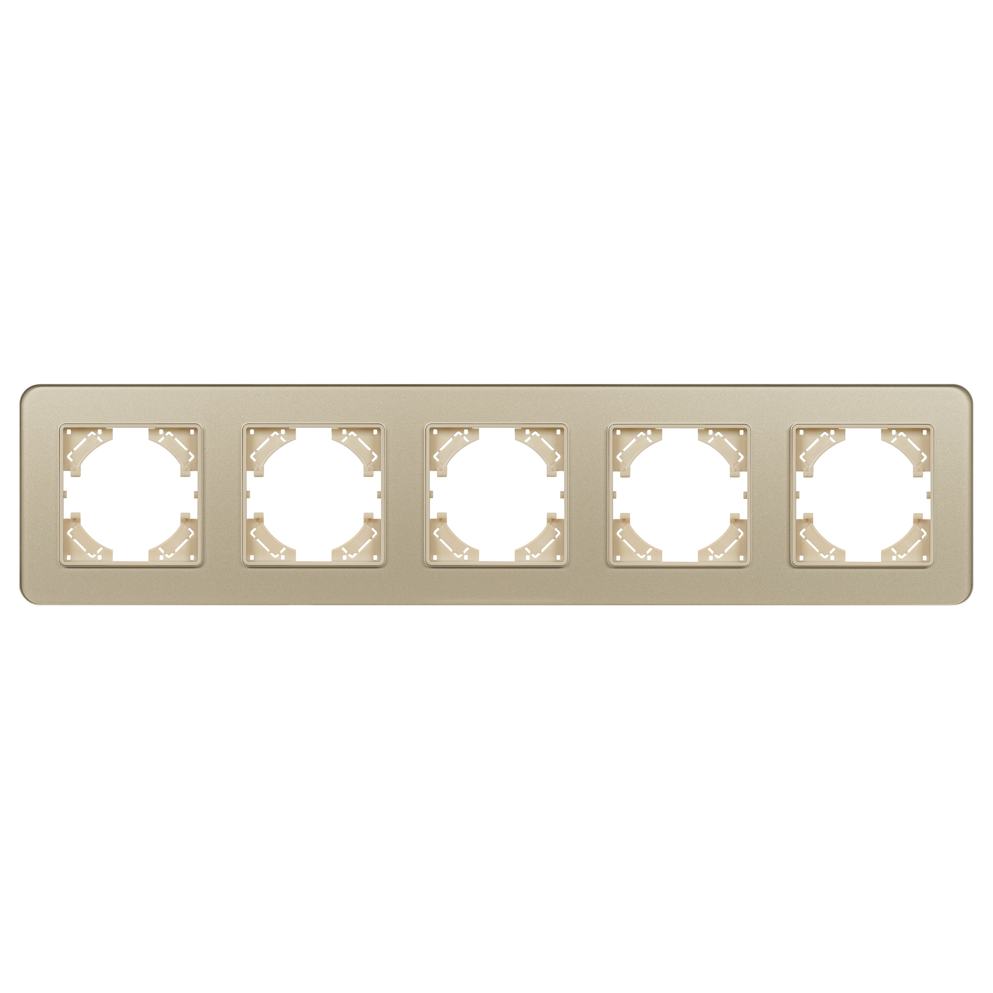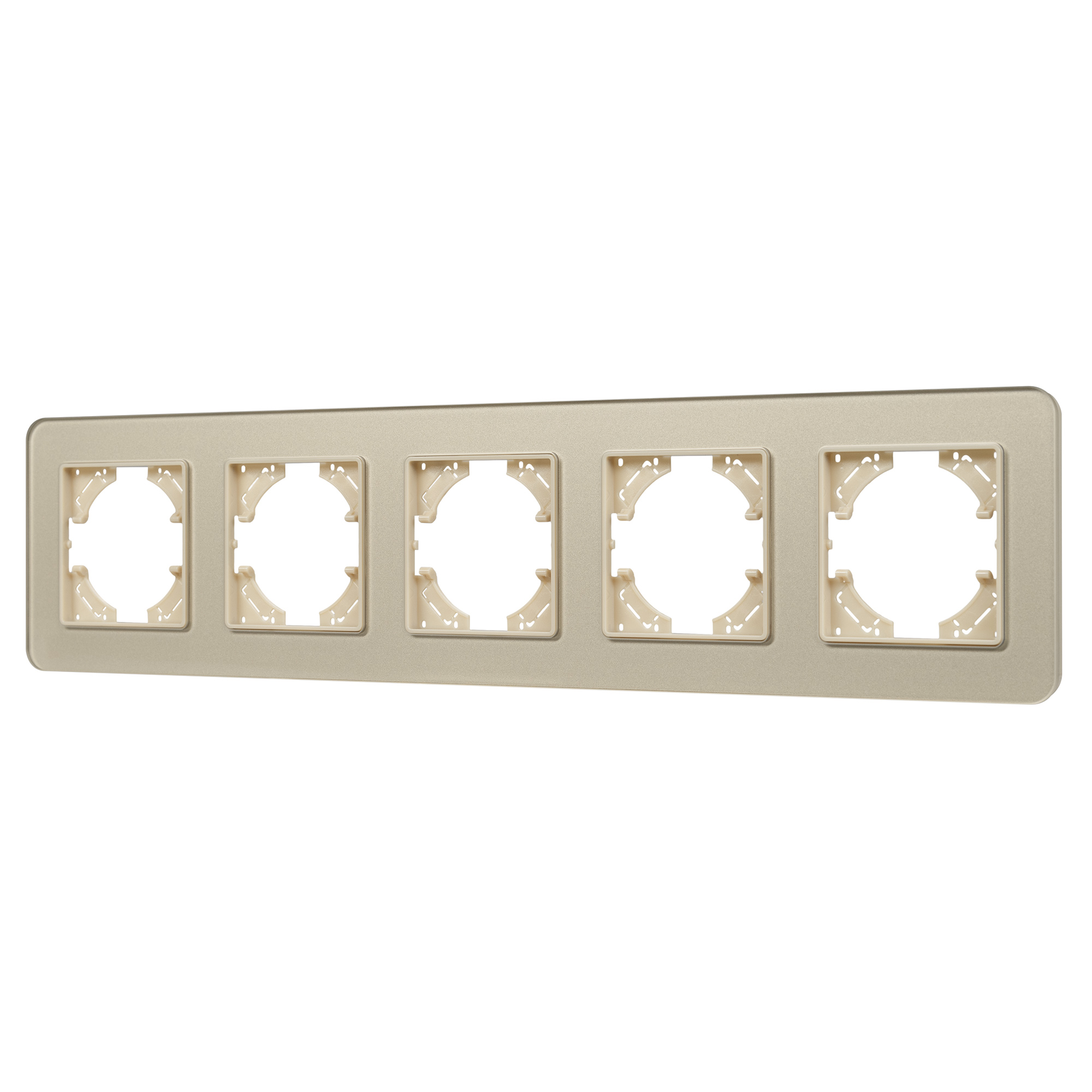 Рамка стеклянная на 5 постов, под встраиваемый механизм. Цвет - золотой. Среднего уровня герметичности IP20. Ориентация монтажа - горизонтальная (основным ориентиром служат посадочные выступы для накладки механизма).