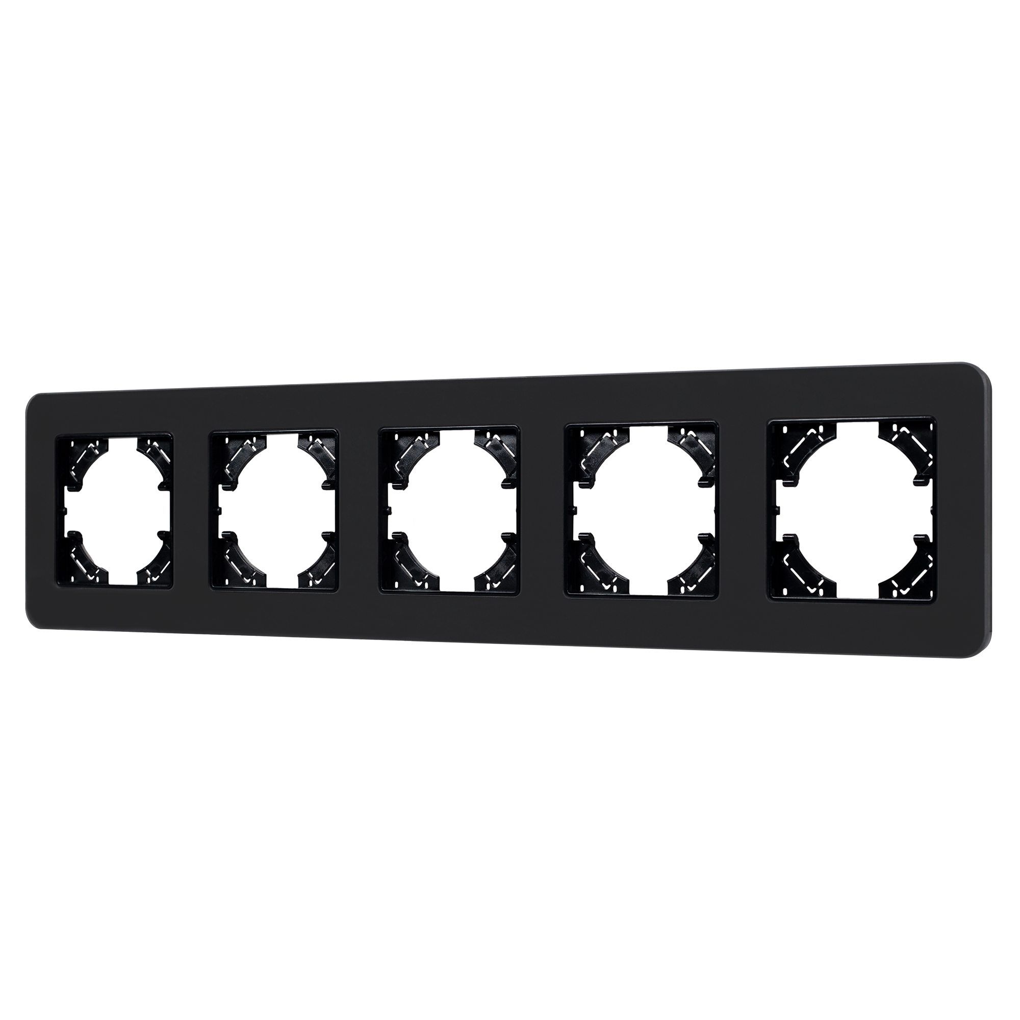 Рамка стеклянная на 5 постов, под встраиваемый механизм. Цвет - черный с Soft-Touch покрытием. Среднего уровня герметичности IP20. Ориентация монтажа - горизонтальная (основным ориентиром служат посадочные выступы для накладки механизма).