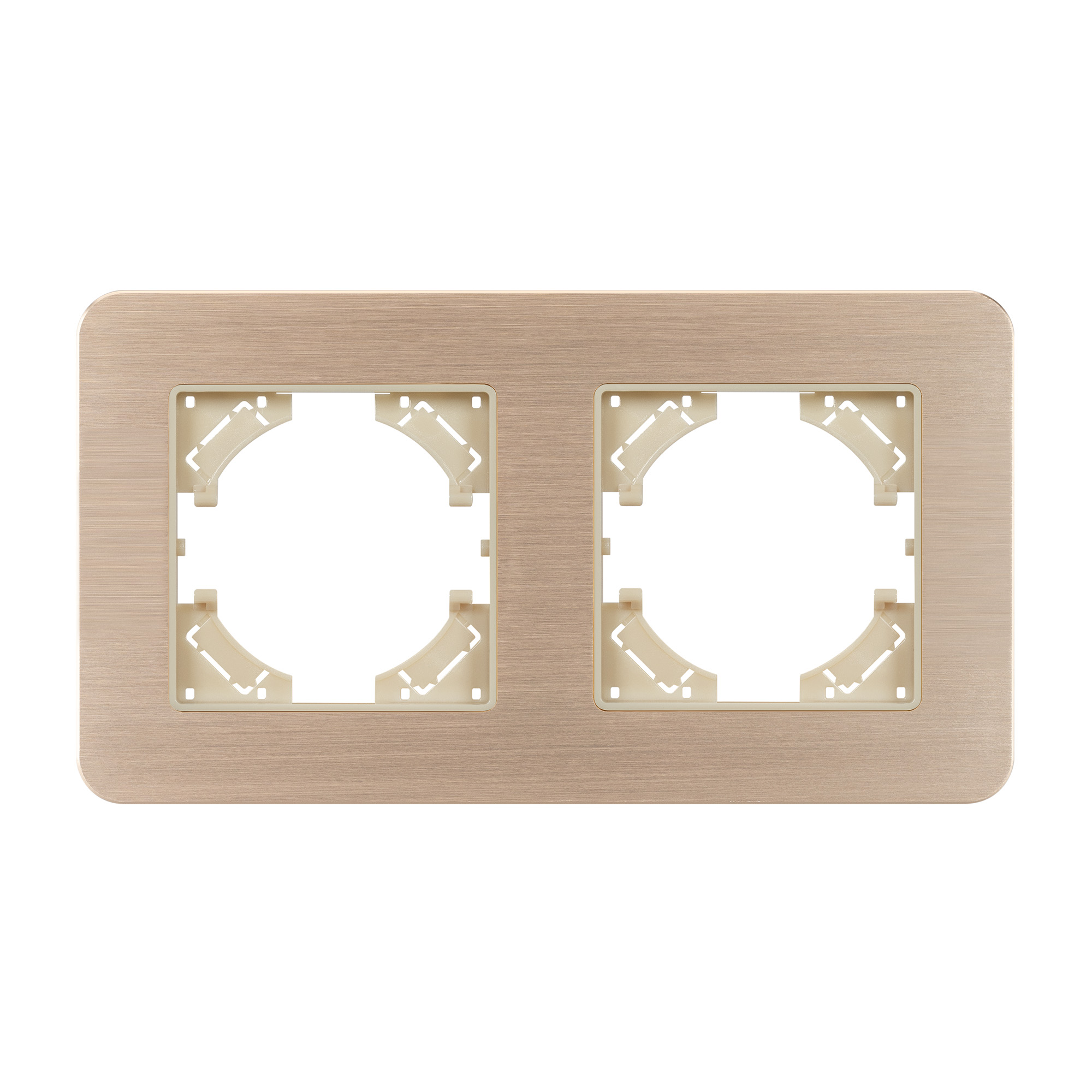 Рамка алюминиевая на 2 поста, под встраиваемый механизм. Цвет - золотой. Среднего уровня герметичности IP20. Ориентация монтажа - горизонтальная (основным ориентиром служат посадочные выступы для накладки механизма).