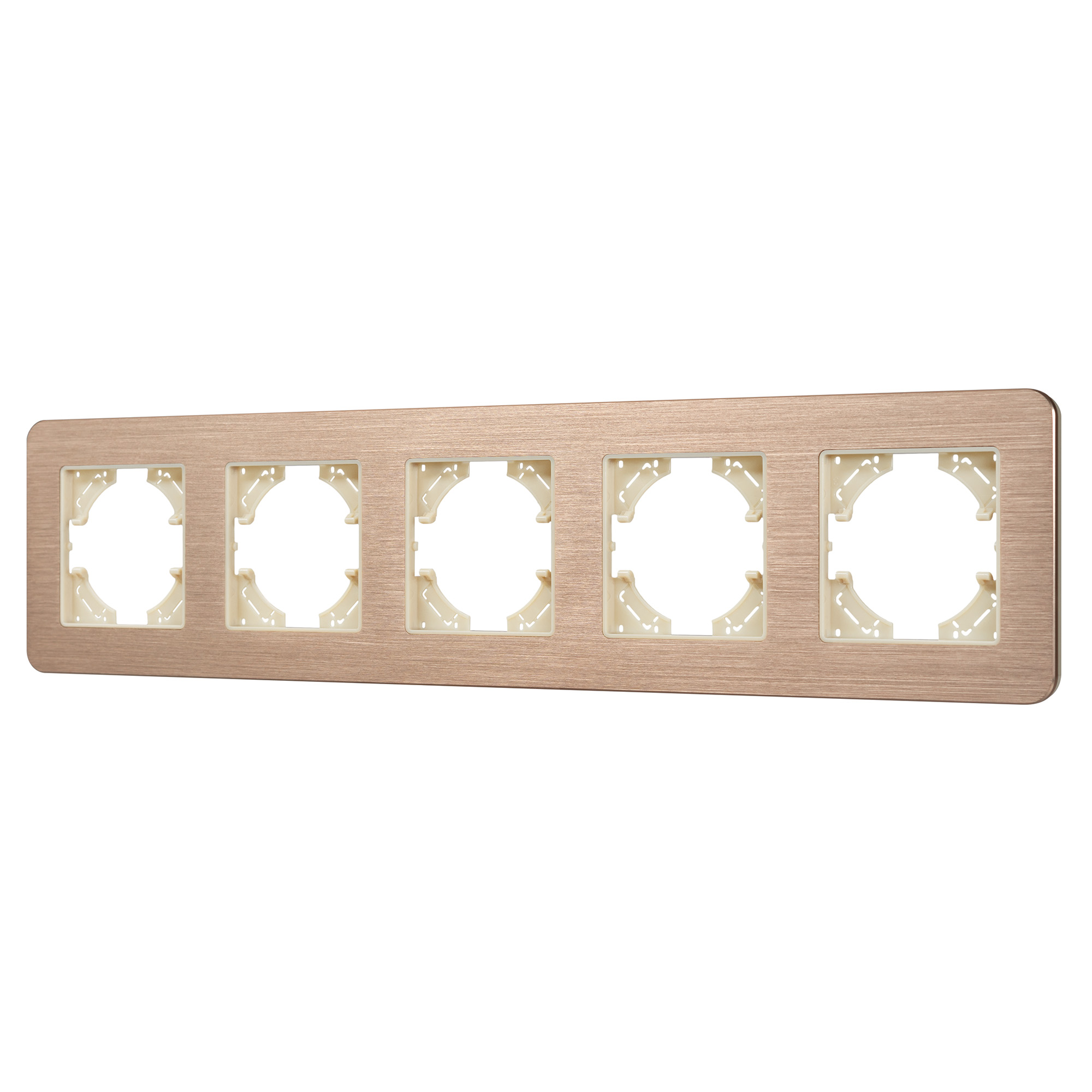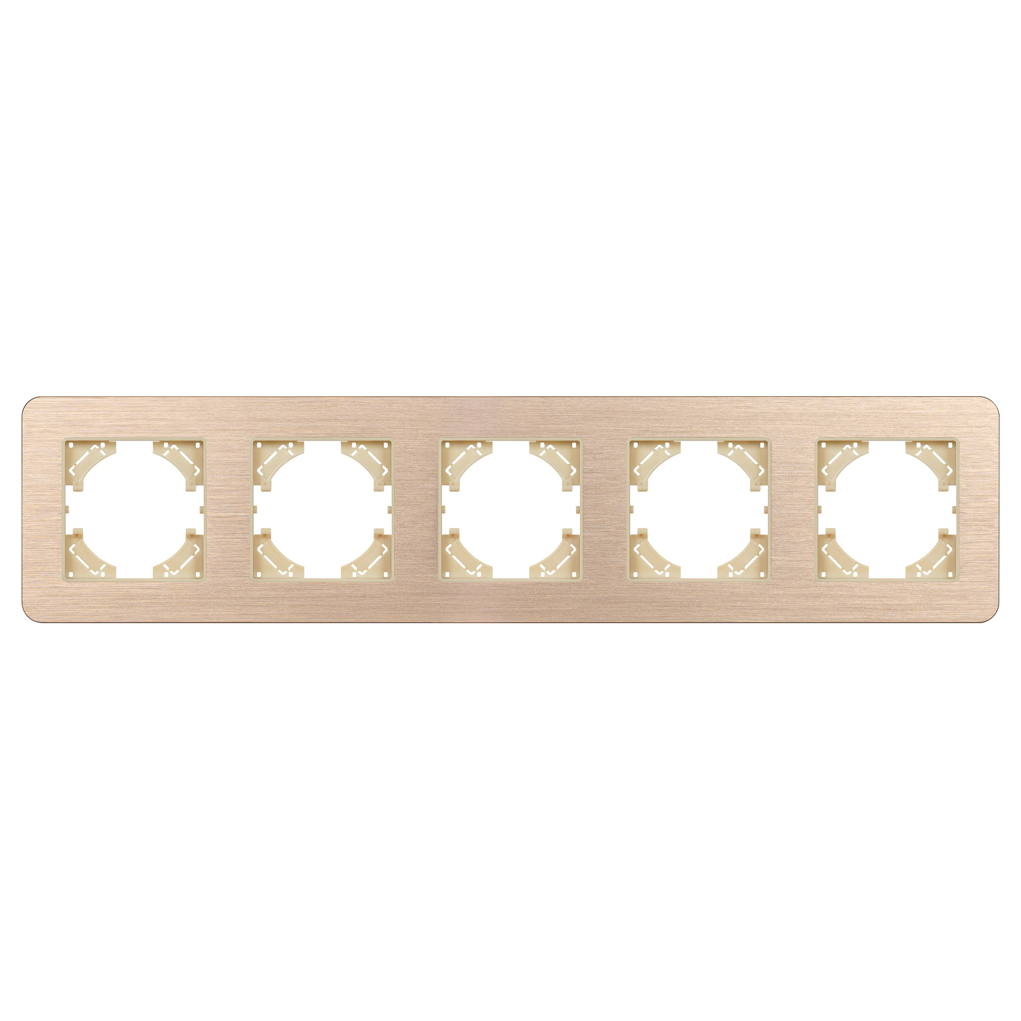 Рамка алюминиевая на 5 постов, под встраиваемый механизм. Цвет - золотой. Среднего уровня герметичности IP20. Ориентация монтажа - горизонтальная (основным ориентиром служат посадочные выступы для накладки механизма). Габаритные размеры: длина 370 мм, ширина 86 мм, высота 7 мм. Гарантийный срок 12 мес.