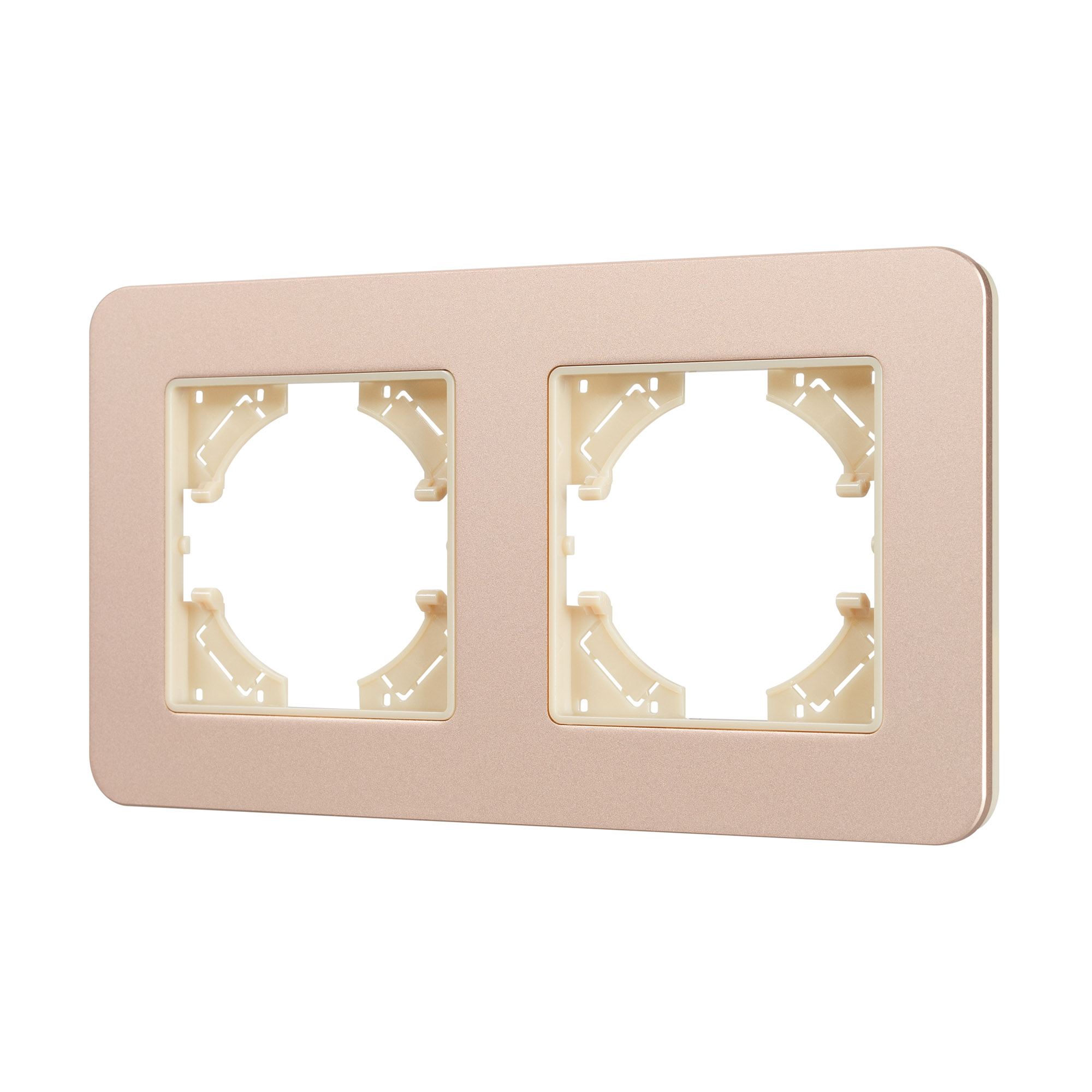 Рамка алюминиевая на 2 поста, под встраиваемый механизм. Цвет - золотой с Soft-Touch покрытием. Среднего уровня герметичности IP20. Ориентация монтажа - горизонтальная (основным ориентиром служат посадочные выступы для накладки механизма).