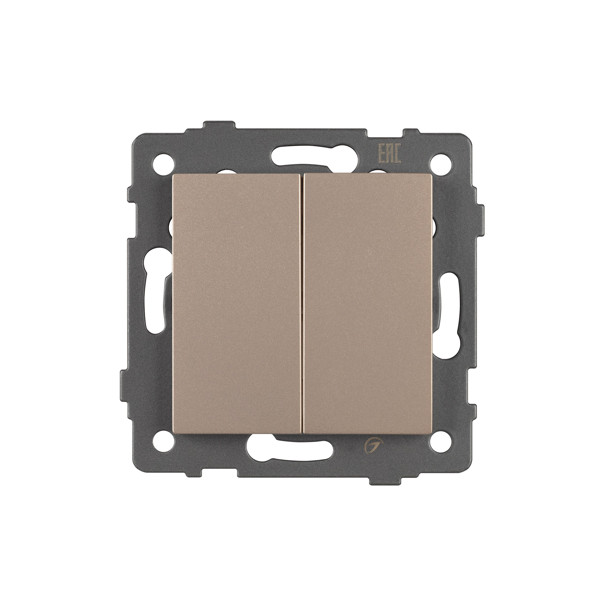 Механизм выключателя света клавишный на 1 пост 2 клавиши (непроходной). Цвет - золотой. Без фронтальной рамки. Уровень пылевлагозащиты IP20. Выключатель устанавливается в стандартный круглый подрозетник.