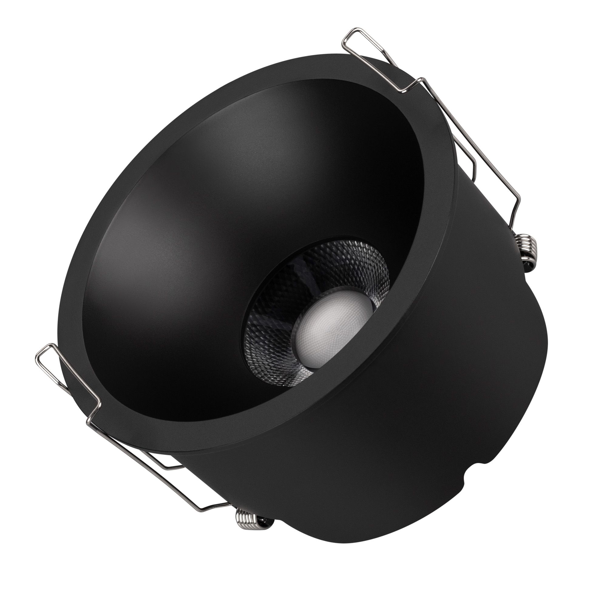 Встраиваемый светильник даунлайт. Мощность 20 Вт, св. поток 1810 лм, 90 лм/Вт, тёплый 3000 K, CRI>90, угол 24°, напряжение питания 230 В. Чёрный круглый корпус из алюминия, степень защиты IP20. Размер: диаметр 123 мм, высота 68 мм. Монтаж встраиваемый, установочное отверстие: диаметр 110 мм. UGR<14. Драйвер 27-42 В, 500 мА, пульсация <2%.
