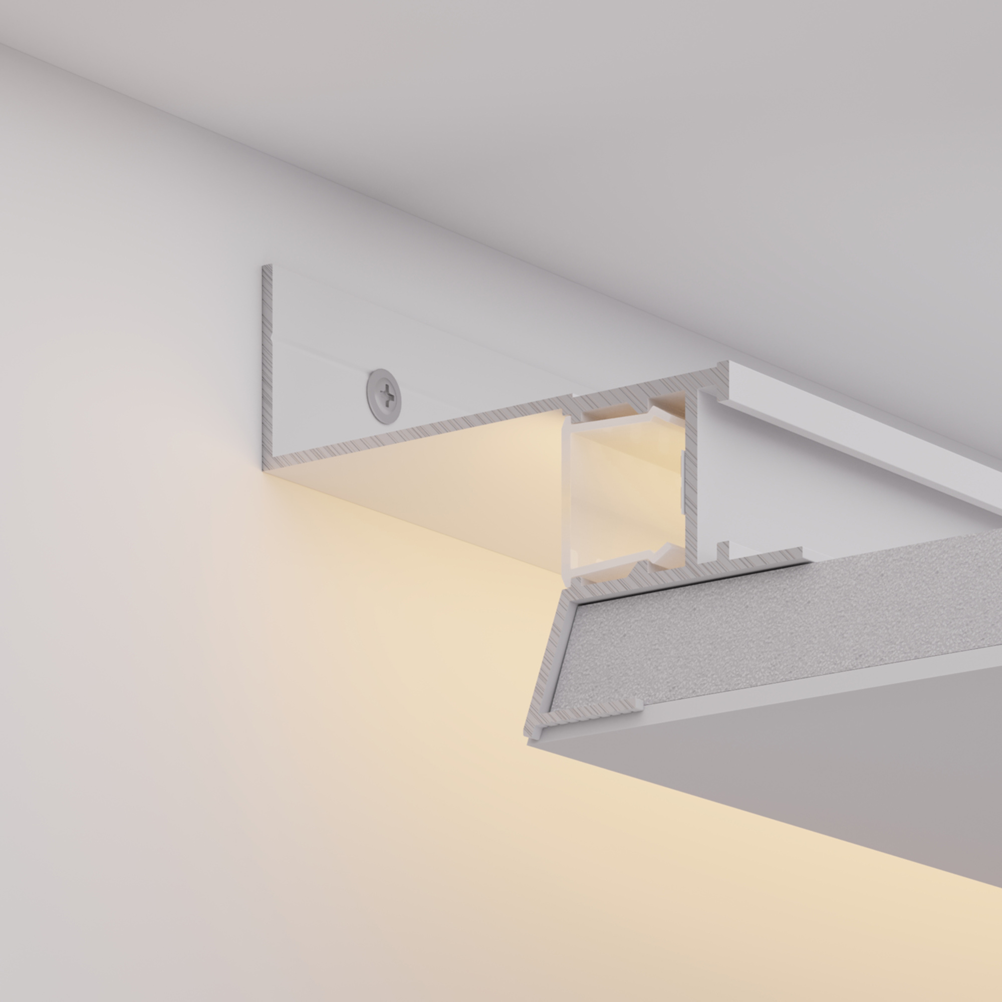 Профиль для создания эффекта парящего потолка с мягким свечением по периметру помещения. Ширина зазор между потолком и стеной 39,2 мм делает его идеальным решением для коммерческих объектов и помещений с высокими потолками. Встраиваемый алюминиевый профиль белого цвета со скрытым фланцем устанавливается в потолки и потолочные ниши из гипсокартона толщиной 12,5 мм.