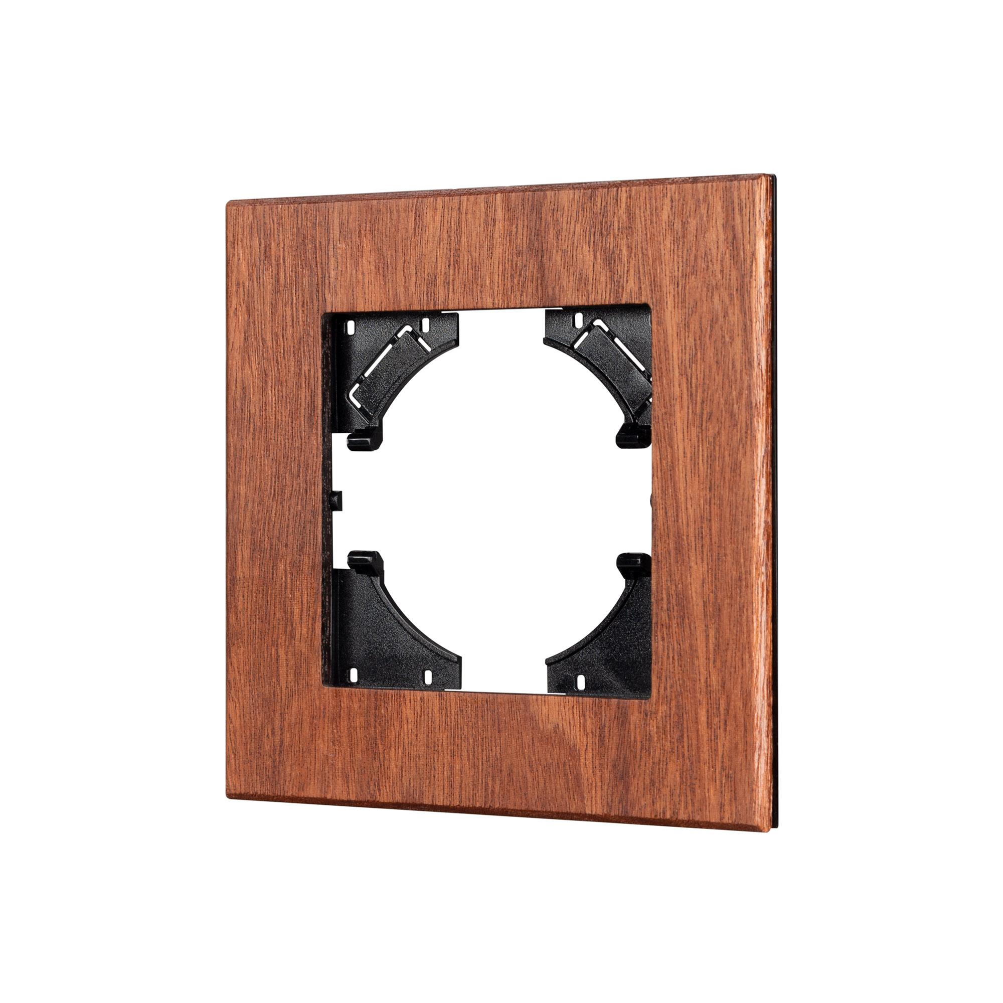 Рамка пластиковая на 1 пост с накладкой из натурального дерева, под встраиваемый механизм. Цвет - натуральное дерево*. Среднего уровня герметичности IP20. Ориентация монтажа - горизонтальная (основным ориентиром служат посадочные выступы для накладки механизма).