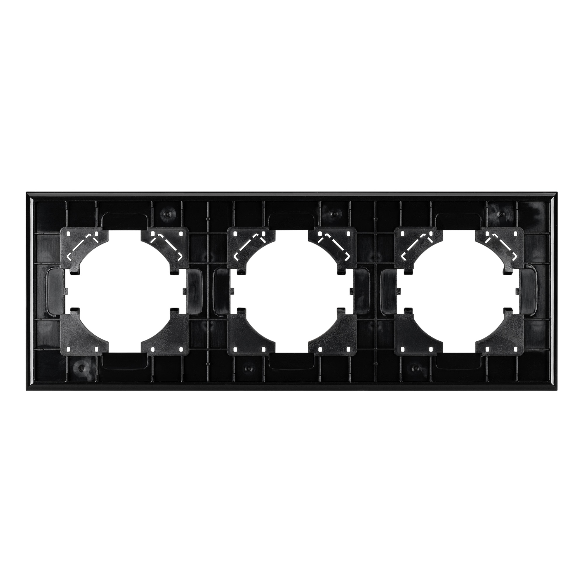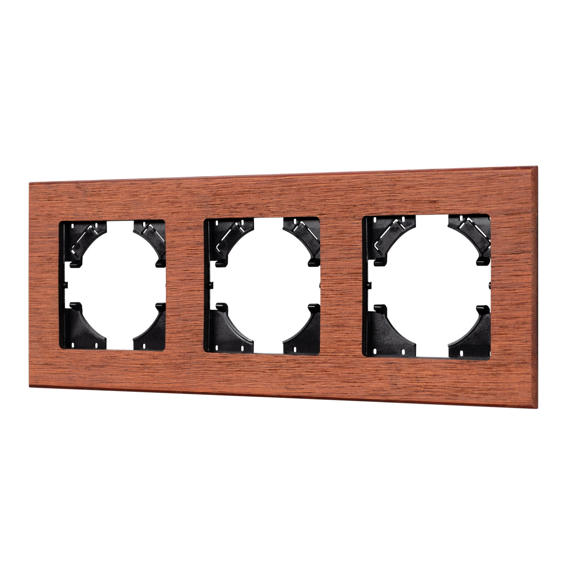 Рамка пластиковая на 3 поста, под встраиваемый механизм, с накладкой из натурального дерева. Цвет накладки - натуральное дерево*, цвет рамки - черный. Среднего уровня герметичности IP20. Ориентация монтажа - горизонтальная (основным ориентиром служат посадочные выступы для накладки механизма).