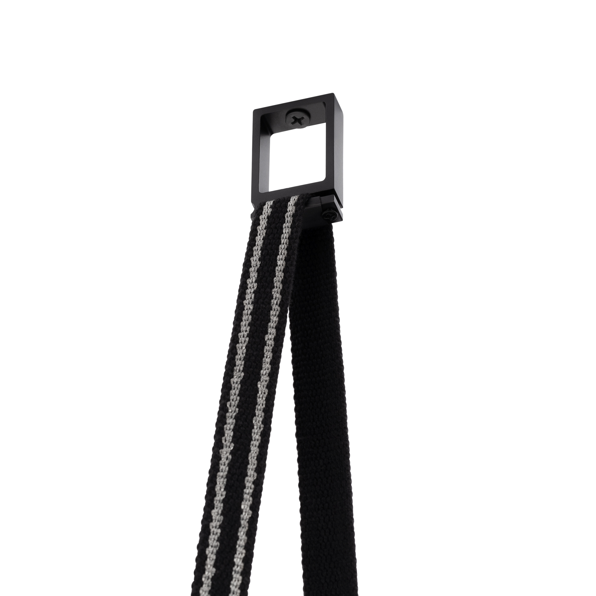 Потолочная крепление в виде проушины черного цвета для подвесного монтажа профиля на токопроводящие ремни. Крепится к потолку. Габаритные размеры (L×W×H): 10x28x45,5 мм.