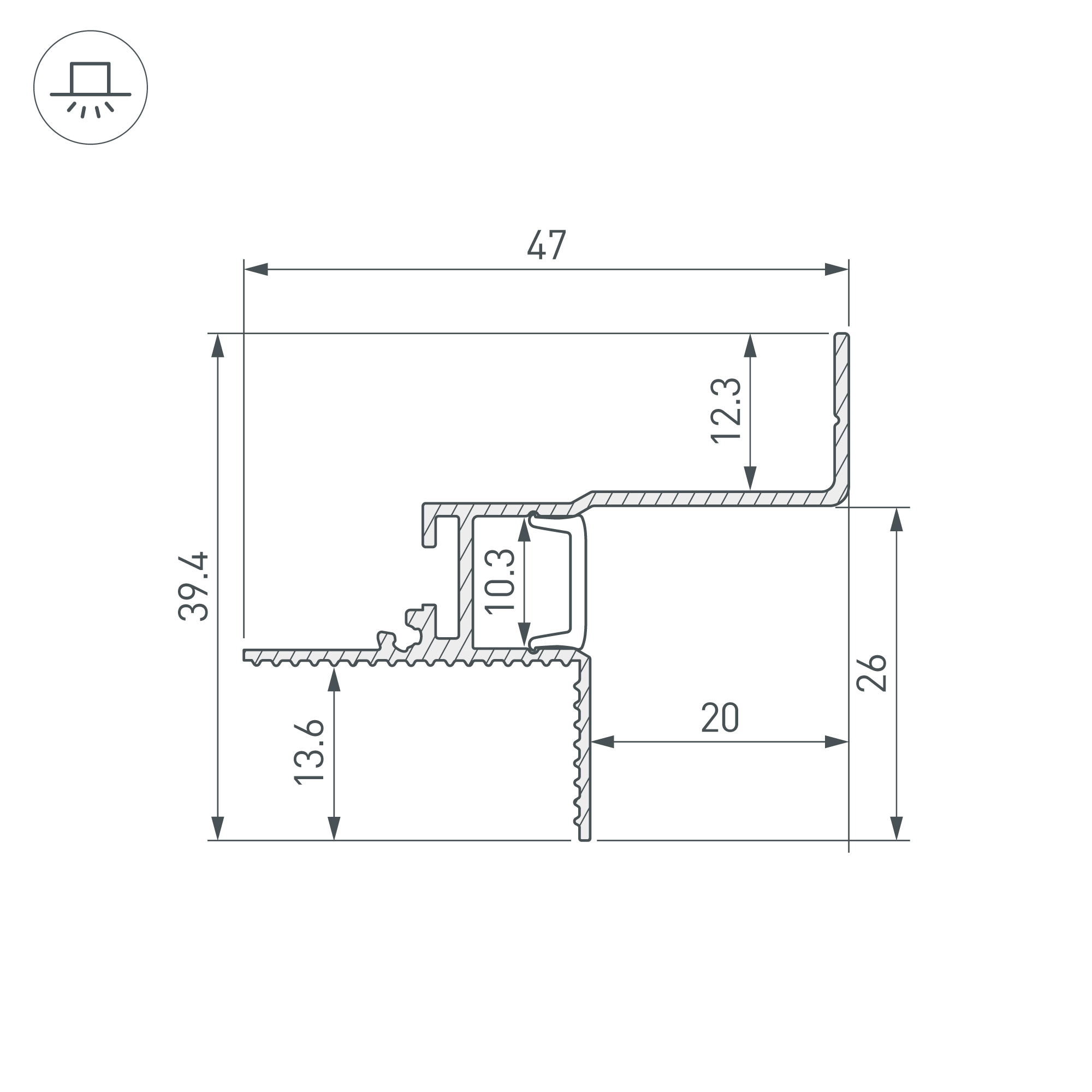 Габаритные размеры профиля составляют 3000 мм в длину, 47 мм в ширину и 39,4 мм в высоту. Площадка для установки светодиодных лент позволяет использовать ленту шириной до 10,3 мм. Это обеспечивает гибкость в выборе светодиодных лент и создает потрясающие световые решения.