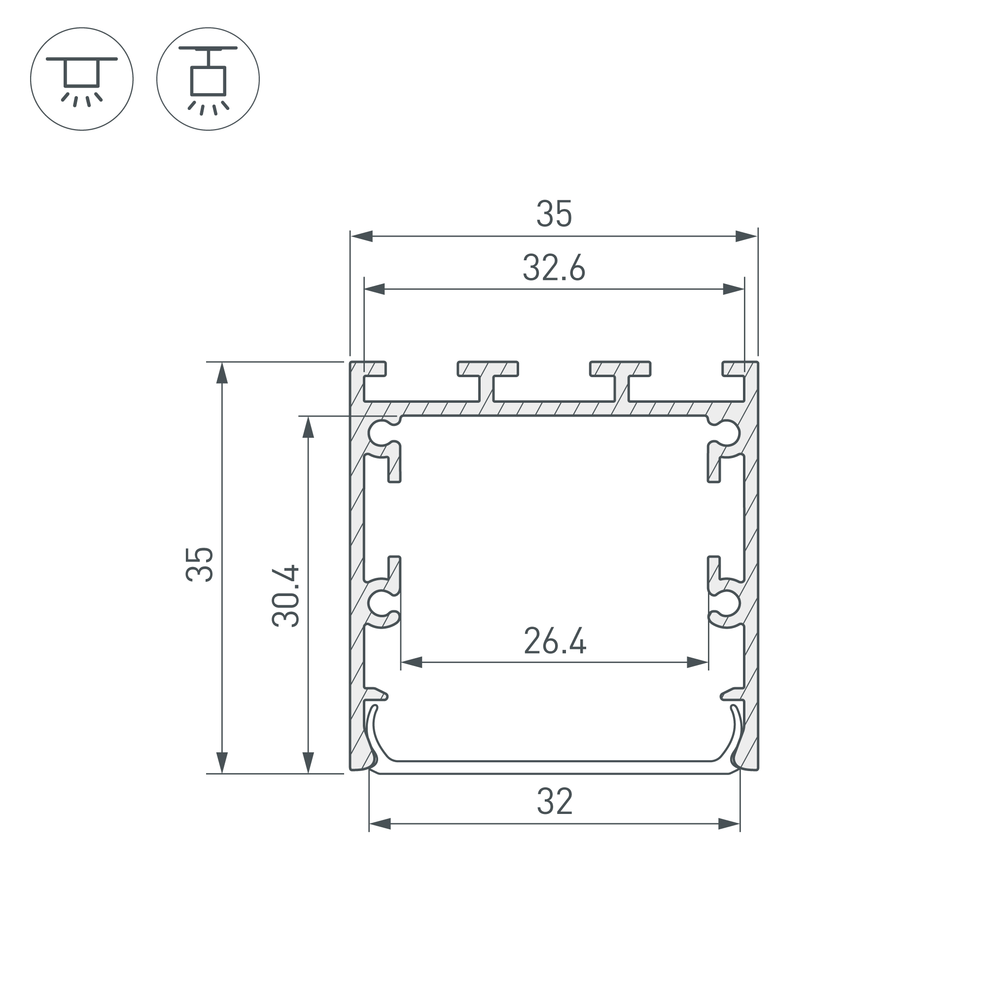 Габаритные размеры профиля составляют 3000 мм в длину, 35 мм в ширину и 35 мм в высоту. Площадка для установки светодиодных лент позволяет использовать ленту шириной до 26,4 мм и мощностью до 37 Вт/м. Это обеспечивает гибкость в выборе светодиодных лент и создает потрясающие световые решения.