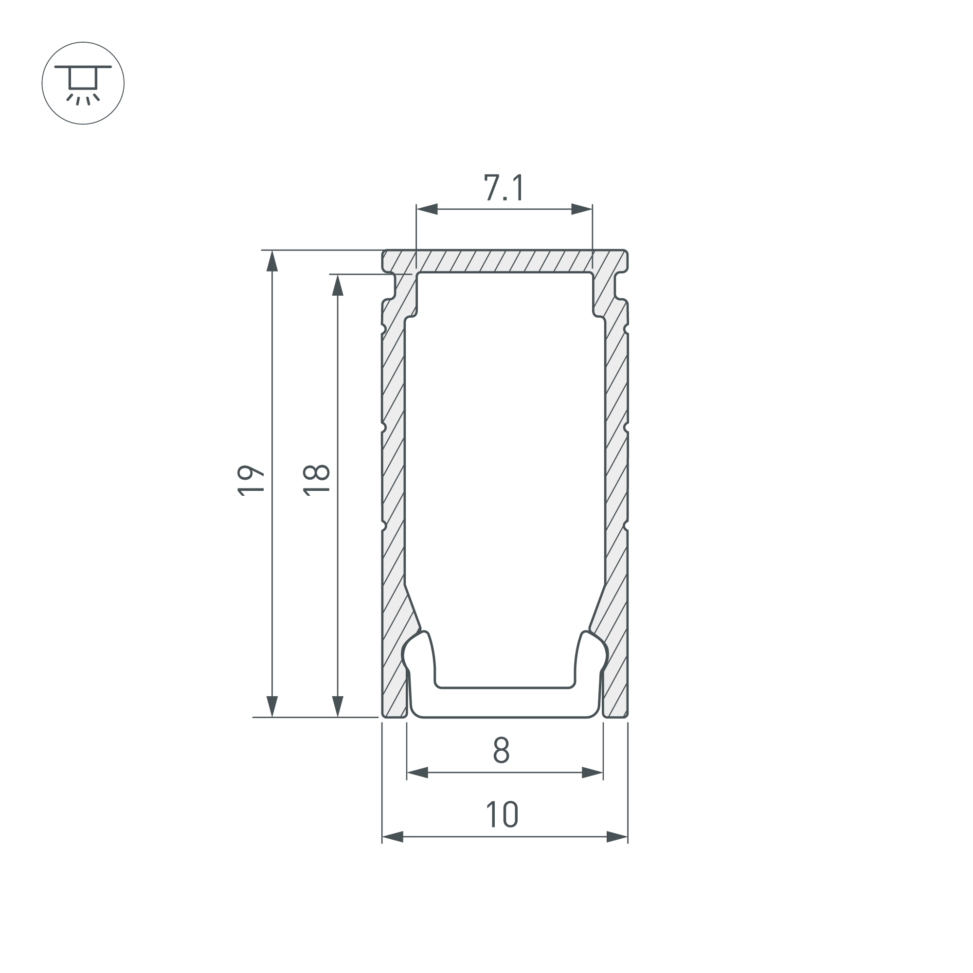 Накладной профиль из анодированного алюминия для подсветки мебели, пазов, ниш и других элементов интерьера. Габаритные размеры профиля составляют 2000 мм в длину, 10 мм в ширину и 19 мм в высоту. Площадка для установки светодиодных лент позволяет использовать ленту шириной до 7,1 мм и мощностью до 15,2 Вт/м.