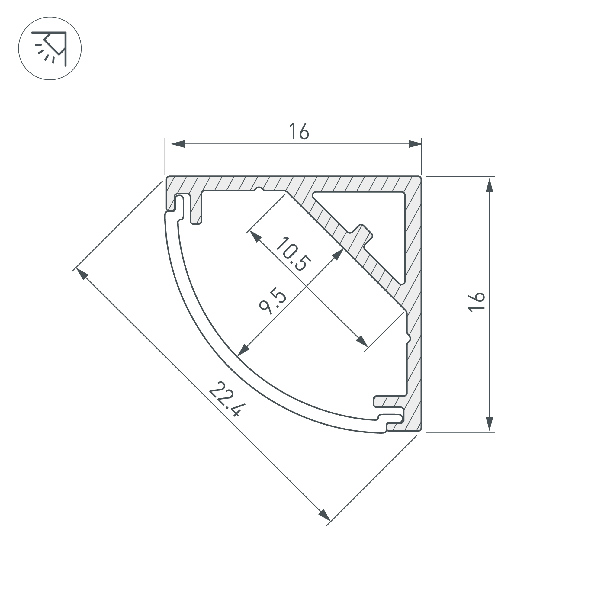 Накладной угловой профиль из анодированного алюминия для подсветки мебели, пазов, ниш и других элементов интерьера. Габаритные размеры профиля составляют 2000 мм в длину, 16 мм в ширину и 16 мм в высоту. Площадка для установки светодиодных лент позволяет использовать ленту шириной до 10,5 мм и мощностью до 14,4 Вт/м. Это обеспечивает гибкость в выборе светодиодных лент и создает потрясающие световые решения.