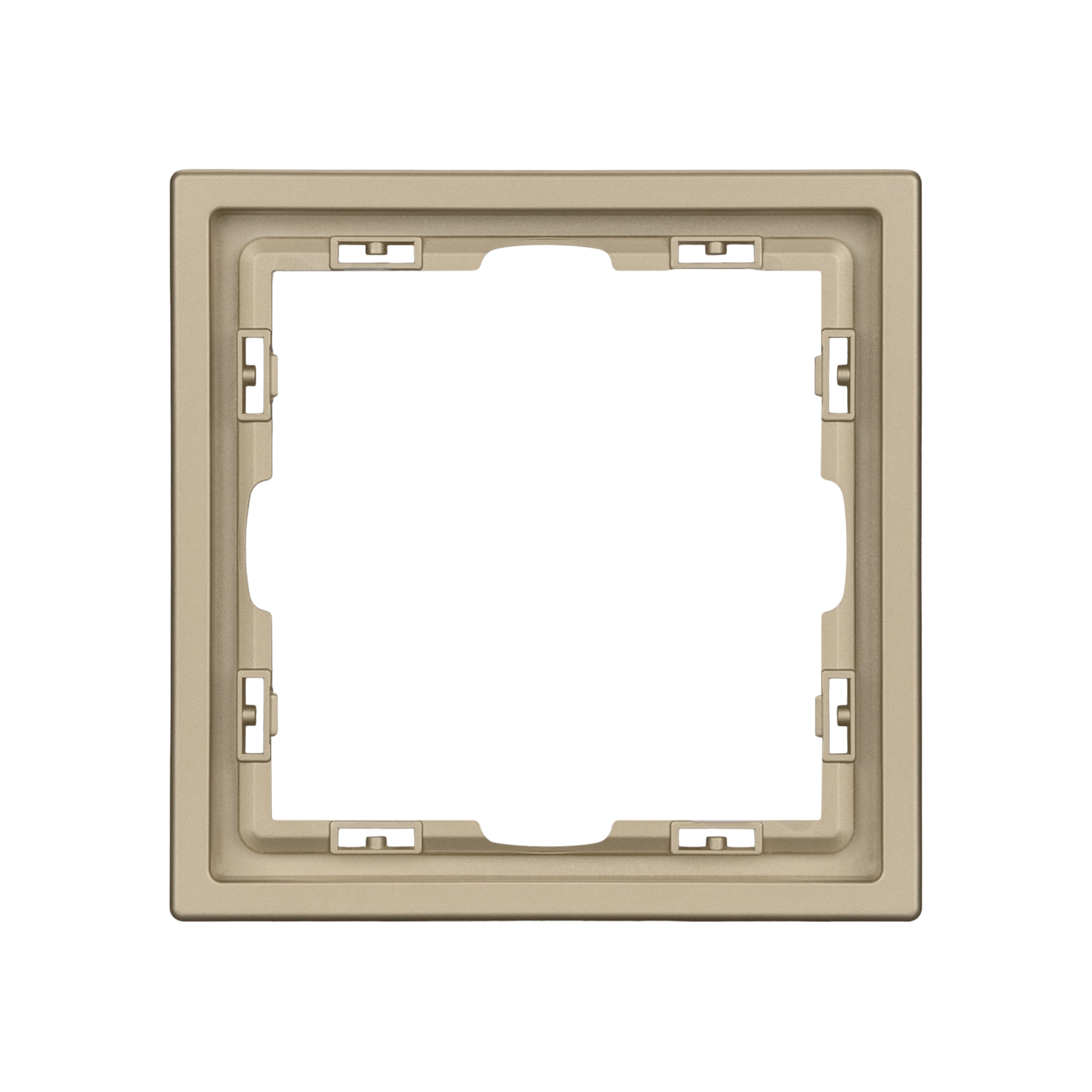 Корпус рамки выполнен в золотом цвете и имеет покрытие Soft-Touch, что придает изделию приятные тактильные свойства. Толщина корпуса составляет 8,5 мм, что позволяет эффективно интегрировать рамку в интерьерные решения любого уровня сложности.