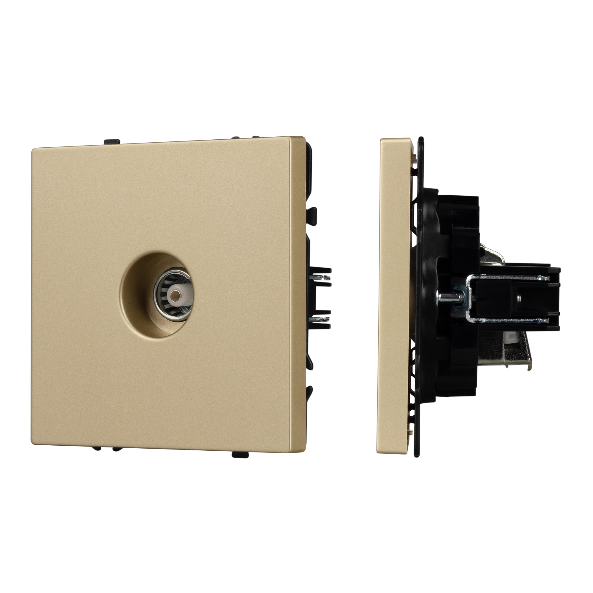 Механизм ТВ-розетки совместим с рамками серии NOBE, создает утонченный минималистичный вид. Скрытый тип монтажа позволяет гармонично встроить в интерьер любого современного дизайн-проекта. Видимая часть выполнена из высококачественного пластика цвета золотой песок и имеет Soft-Touch покрытие, что придает изделию приятные тактильные ощущения и стильный внешний вид.