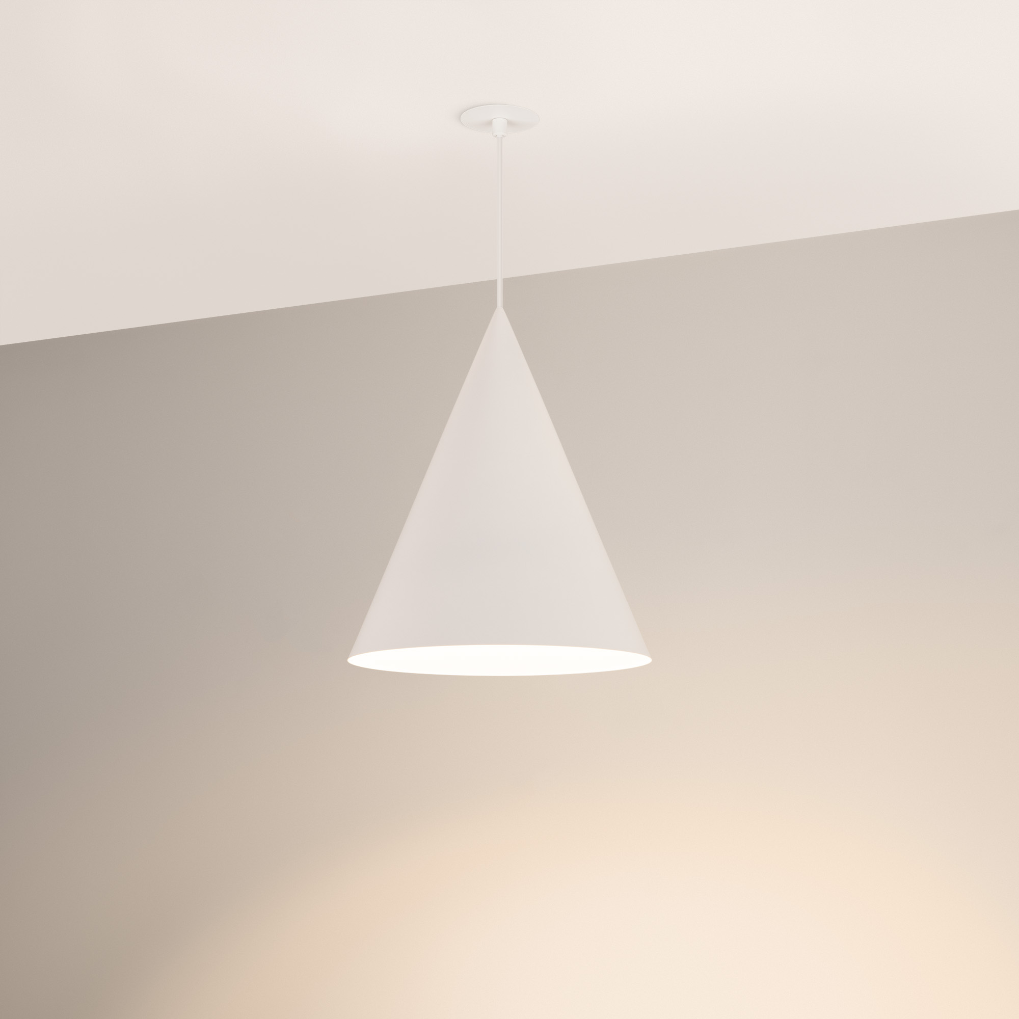 Подвесной светильник. Мощность 14 Вт, св. поток 1200 лм, 87 лм/Вт, теплый 3000 K, CRI>92, угол 36°, напряжение питания 230 В. Белый корпус из алюминия в форме конуса с белой внутренней поверхностью, линза-рассеиватель из PMMA, степень защиты IP20. Размер: диаметр 350 мм, высота 420 мм. Монтаж подвесной, длина подвеса 2000 мм, регулируемая. В комплекте 2 вида чаш. Габариты встраиваемой чаши: Ø 80x23 мм. Габариты накладной чаши Ø140x55 мм. Драйвер 27-42 В, 350 мА, пульсация <1%. Управление по TRIAC.