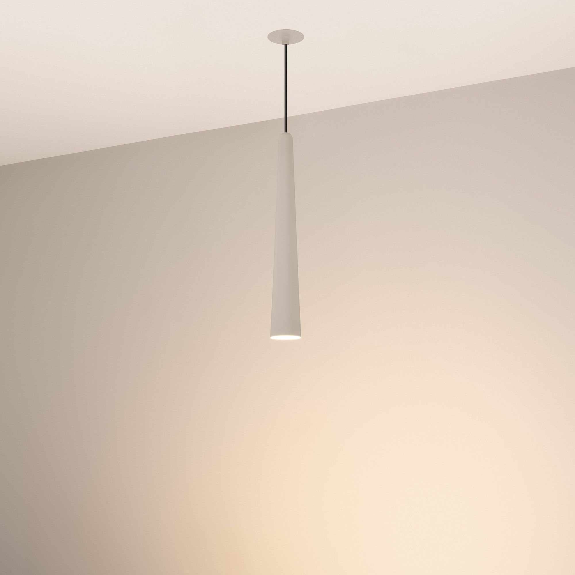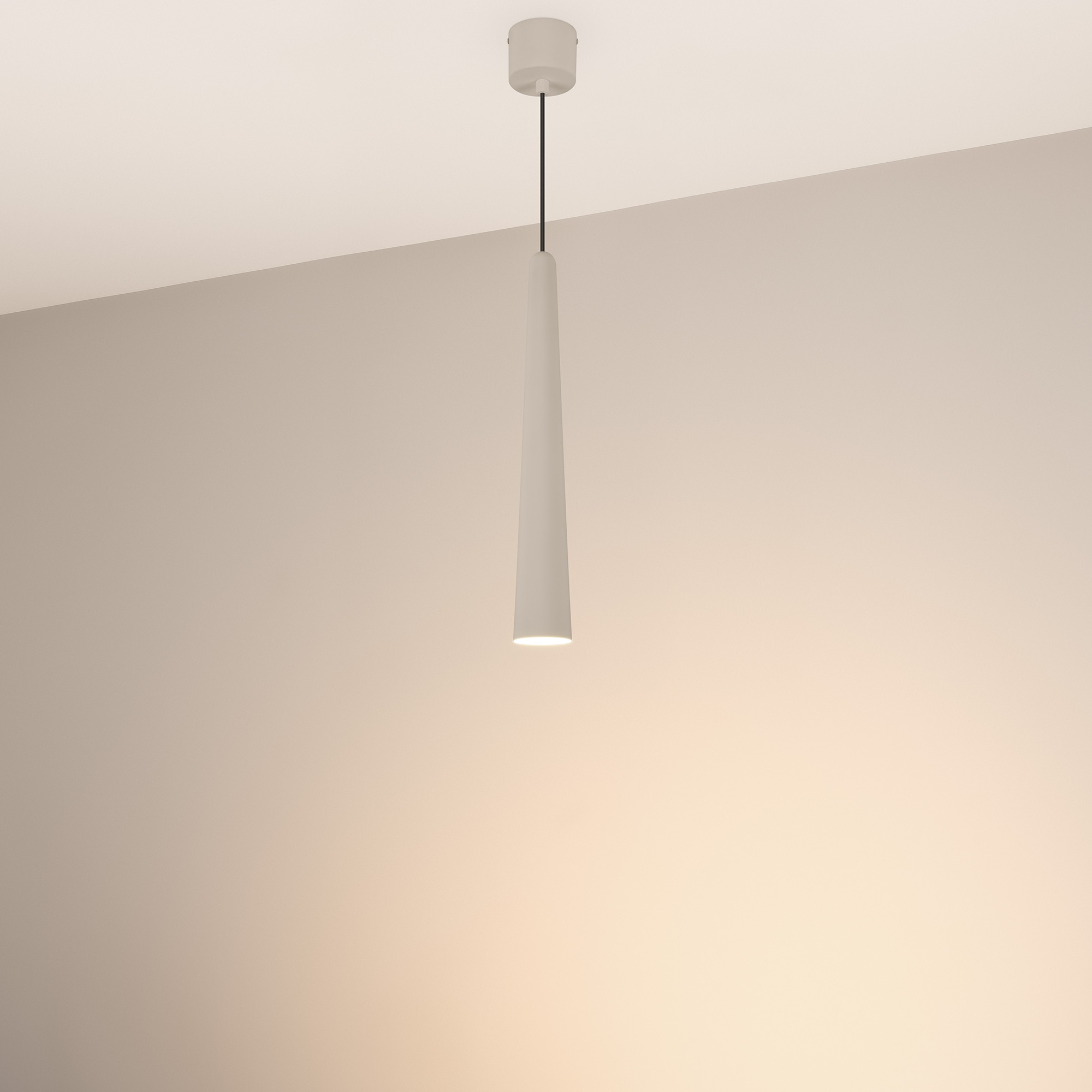 Подвесной светильник. Мощность 5 Вт, св. поток 400 лм, световая эффективность 70 лм/Вт, теплый 3000K, CRI>92, угол 36°, напряжение питания 230 В. Светло - серый конусообразный вытянутый корпус из алюминия, линза из PMMA, степень защиты IP20. Размер: диаметр 57 мм, высота 400 мм. Монтаж подвесной, длина подвеса 2000 мм, регулируемая. В комплекте 2 вида чаш. Габариты встраиваемой чаши: Ø 80x41 мм. Габариты накладной чаши Ø80x60 мм. Драйвер 2,8-12В, 500 мА, пульсация <1%.