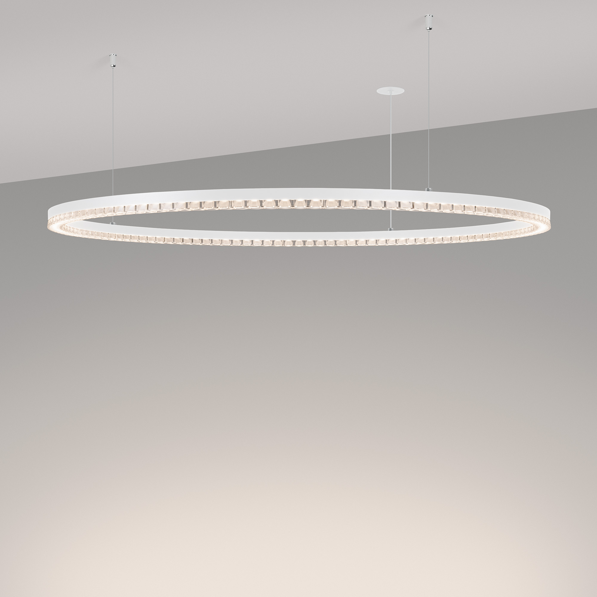 Под заказ. Подвесной светильник. Мощность 80 Вт, св. поток 7010 лм, 80-95 лм/Вт, дневной белый 4000 K, CRI>90, угол 45°, напряжение питания 230 В. Белый круглый корпус из алюминия, экран PMMA, степень защиты IP20. Размер: диаметр 1250 мм, высота 34мм, ширина профиля 30 мм, размер чаши: диаметр 65 мм, высота 26 мм. Монтаж подвесной, длина подвеса 1200 мм, тип чаши встраиваемый, диаметр установочного отверстия чаши 60 мм. Драйвер (2 шт.) 9-38 В, 1050 мА. Пульсация <0,3 %.