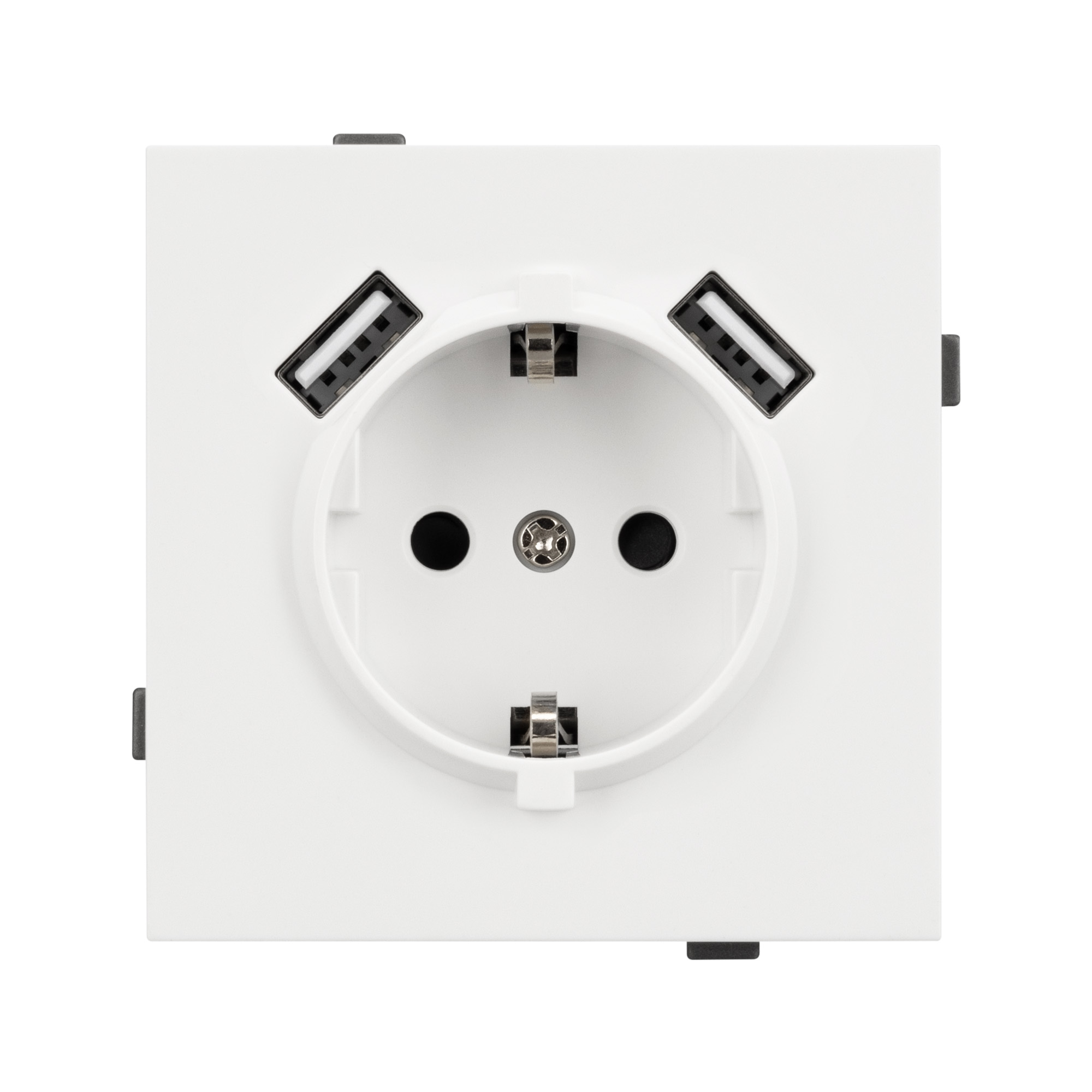 Механизм розетки с заземлением на 1 пост и 2USB Type A порта. Цвет - белый, с Soft-Touch покрытием. Без фронтальной рамки. Уровень пылевлагозащиты IP20. Розетка устанавливается в стандартный подрозетник круглого сечения диаметром 60мм. Габаритные размеры: длина 71 мм, ширина 71 мм, высота 53 мм. Гарантийный срок 10 лет.