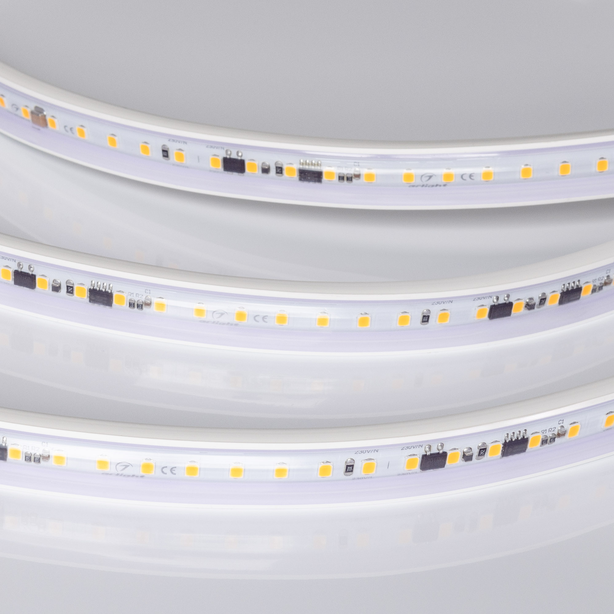 Светодиодная герметичная лента ARL серии A120 со степенью защиты IP65, защитная оболочка из ПВХ устойчива к УФ излучению, что позволяет использовать ее на улице. Высокий индекс цветопередачи CRI>85 обеспечивает точное восприятие цветовых оттенков. Лента подключается непосредственно к сети переменного тока 230 В и не требует использования источников питания. Наличие интегральных стабилизаторов тока позволяет подключать ленту длиной до 50 м, обеспечивая при этом равномерную яркость свечения по всей длине ленты. При подключении нескольких лент необходимо подавать питание на каждые 50 м отдельным кабелем, последовательное подключение лент более 50 м запрещается. Лента применяется для подсветки потолочных ниш, декоративной подсветки, создания контуров рекламных объектов, может использоваться в помещениях и на улице. На лентах установлены микросхемы с функцией снижения тока для защиты ленты от перегрева, обеспечивающие надежную работу в различных условиях. Диммирование в диапазоне 30%-90% осуществляется TRIAC диммерами с установкой минимального уровня яркости. Крепление с помощью скоб, аксессуары для монтажа и подключения поставляются отдельно.