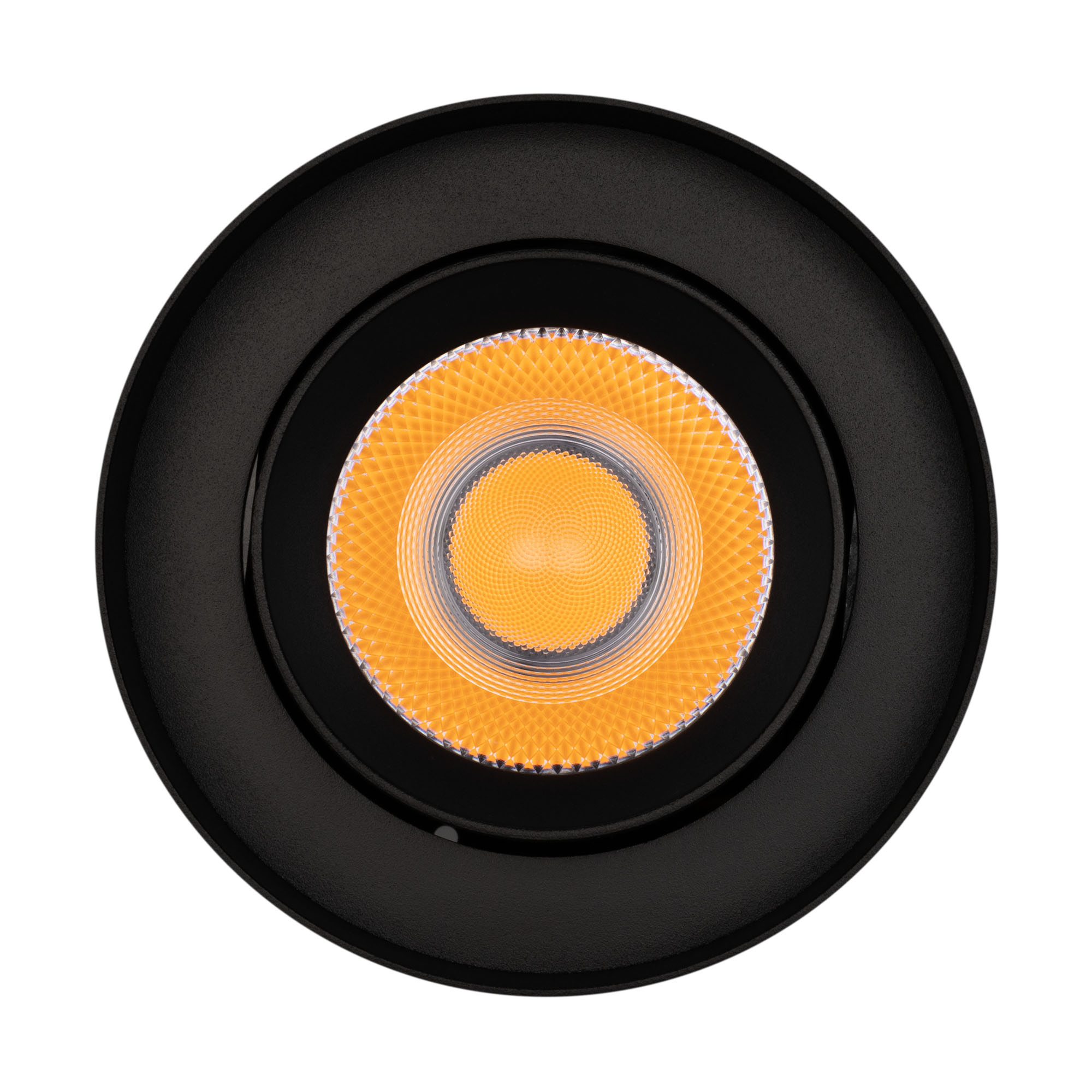 Накладной интерьерный светильник. Мощность 24 Вт, св. поток 2400 лм, 99 лм/Вт, теплый 3000 K, CRI>90, угол 24°, регулируемое направление луча 40°(20+20), поворотный световой модуль вокруг своей оси на 340°, UGR <11, напряжение питания 230 В. Чёрный круглый корпус из алюминия, степень защиты IP54. Размер: диаметр 132 мм, высота 165 мм. Монтаж накладной. Драйвер 27-45 В, 600мА, пульсация <1%.