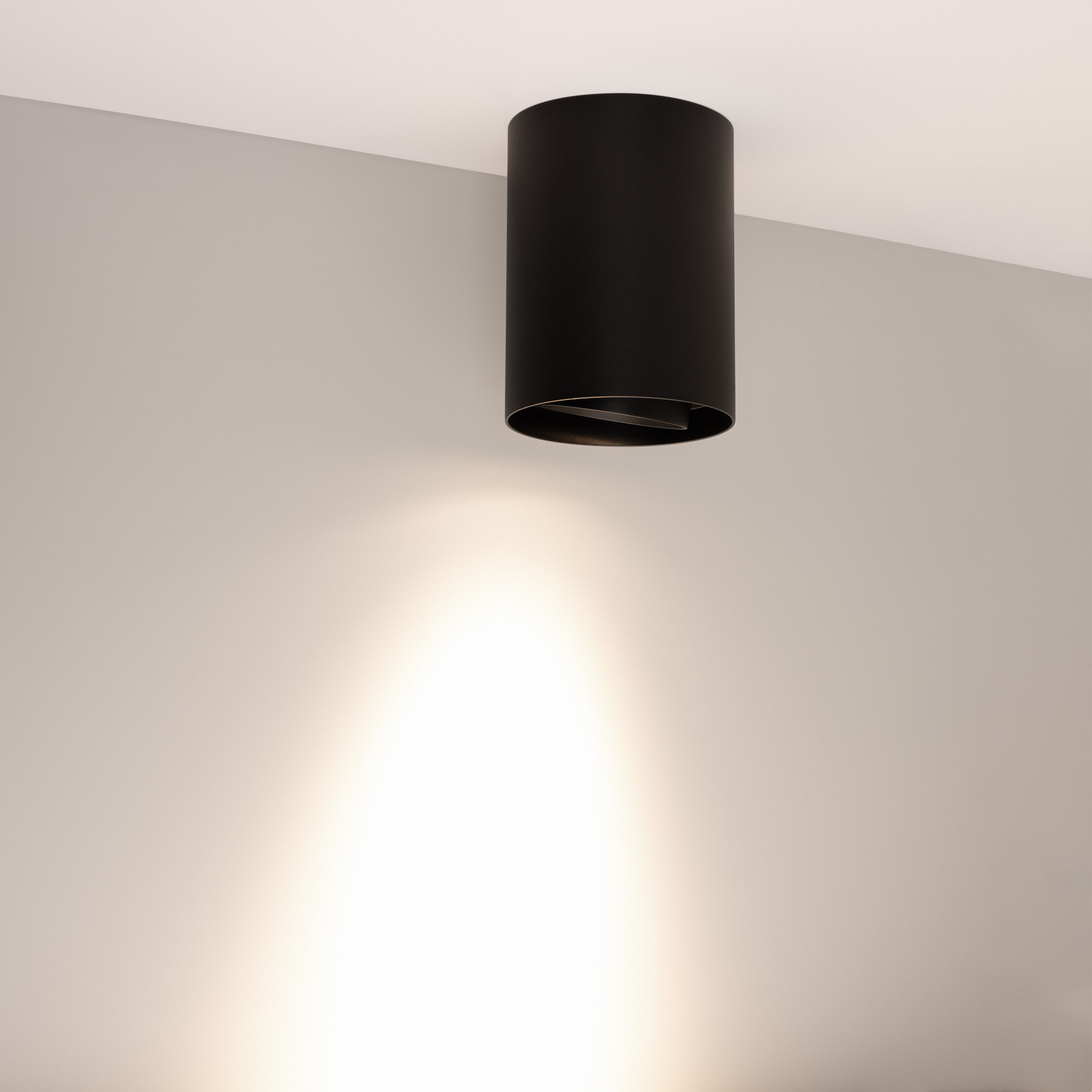 Накладной интерьерный светильник. Мощность 18 Вт, св. поток 1700 лм, 99 лм/Вт, дневной 4000 K, CRI>90, угол 24°, регулируемое направление луча 40°(20+20), поворотный световой модуль вокруг своей оси на 340°, UGR <11, напряжение питания 230 В. Чёрный круглый корпус из алюминия, степень защиты IP54. Размер: диаметр 110 мм, высота 145 мм. Монтаж накладной. Драйвер 27-43 В, 450 мА, пульсация <1%.
