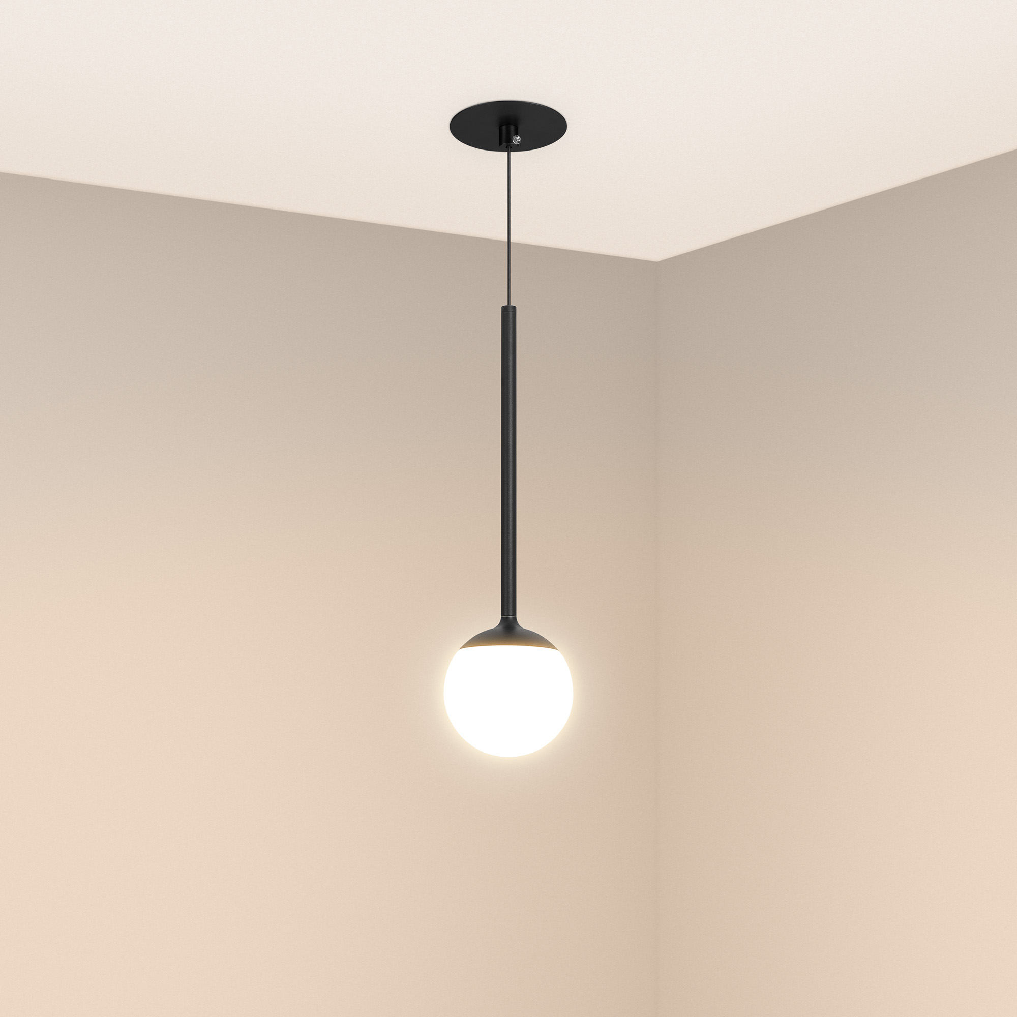 Встраиваемый подвесной светильник. Мощность 8 Вт, св. поток 620 лм, 80 лм/Вт, теплый 3000 K, CRI>90, угол 180°, напряжение питания 230 В. Черный круглый корпус из алюминия и стали, рассеиватель акрил, степень защиты IP20. Размер: диаметр 100 мм, высота ножки 244 мм, длина подвеса 1150 мм. Размеры чаши Ø 92x50 мм, размер врезного отверстия Ø 82 мм. Диаметр провода Ø 4 мм. Монтаж встраиваемый. Драйвер 13-24 В, 300 мА, пульсация <1%.