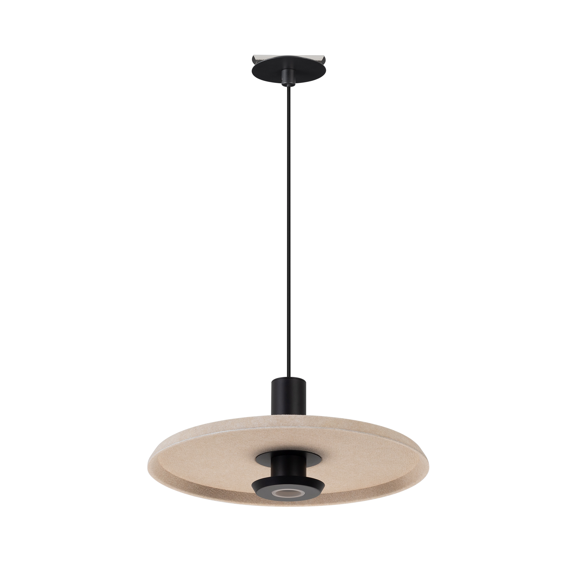 Подвесной светильник. Мощность 12 Вт, св. поток 597 лм, 49 лм/Вт, теплый 2700 K, CRI>94, угол 36°, напряжение питания 230 В. Бежевый фигурный корпус из переработанного фетра с бежевой внутренней поверхностью, линза-рассеиватель из PMMA, степень защиты IP20. Размер: диаметр 350 мм, высота 145 мм. Монтаж подвесной, длина подвеса 2000 мм, регулируемая. В комплекте 2 вида чаш. Габариты чаши (встраиваемая) Ø80 х 23 мм, врезное отверстие Ø60 мм. Габариты чаши (накладная) Ø120 x 35 мм. Драйвер 59 В, 300 мА, пульсация <1%. Управление по TRIAC.