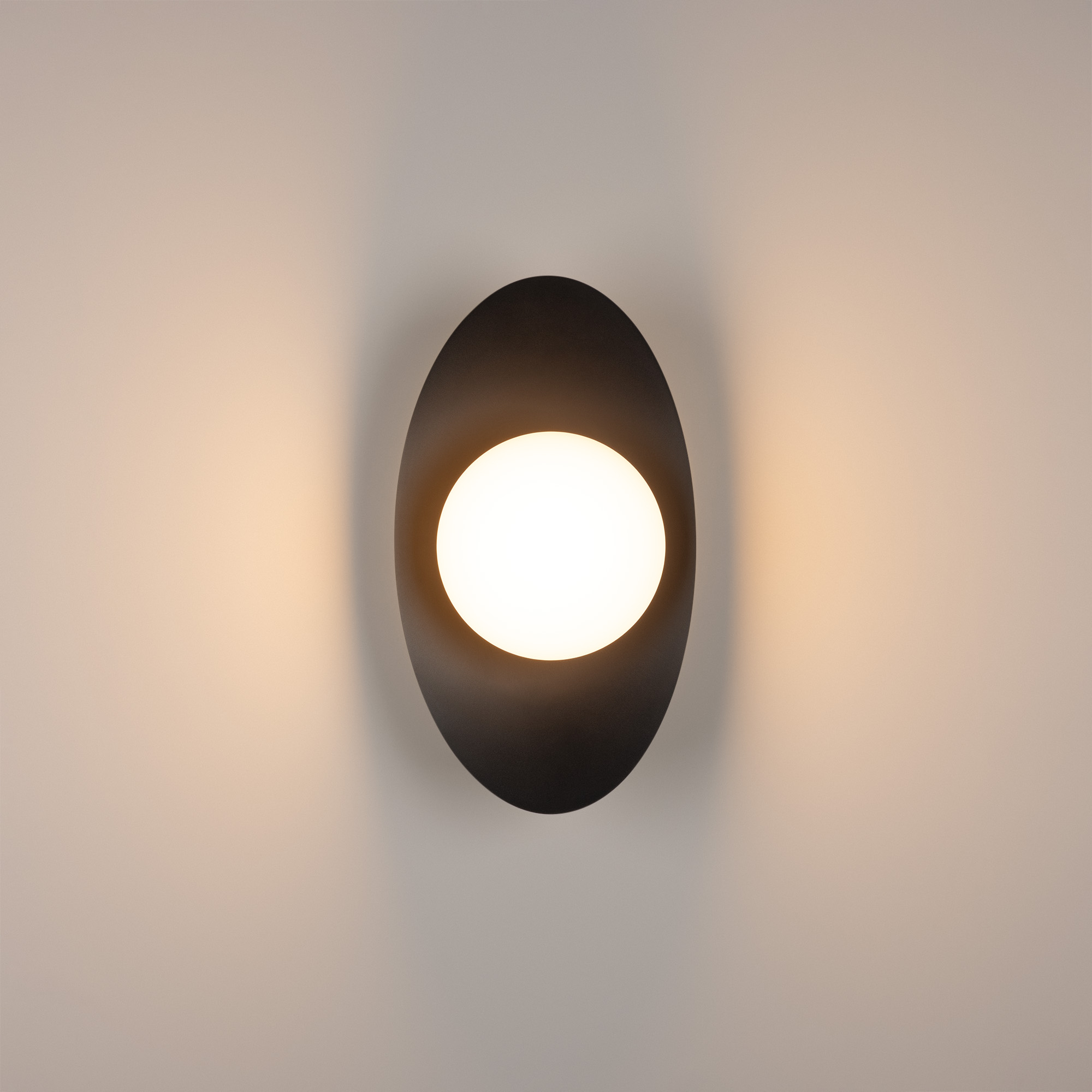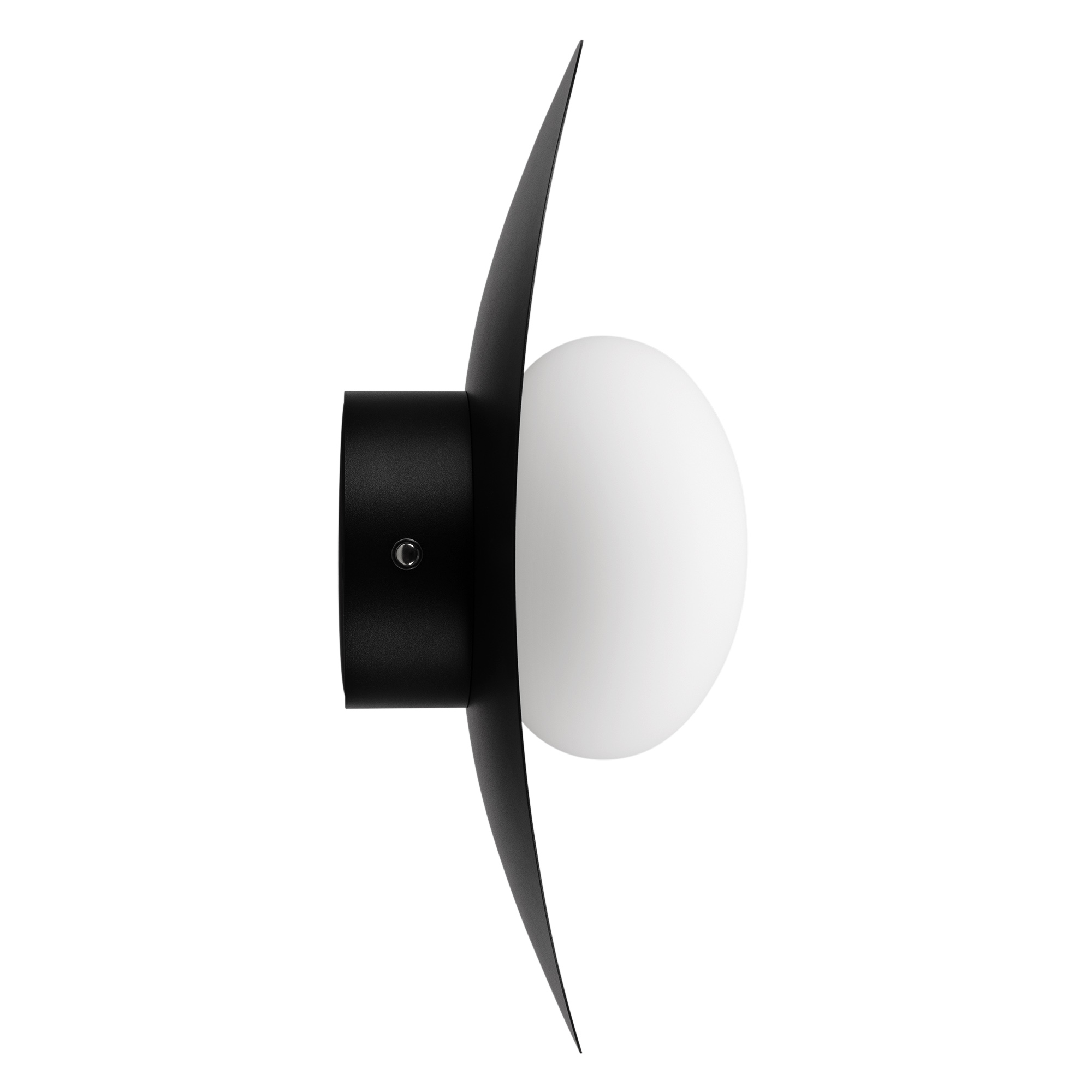 Декоративный настенный светильник. Мощность 6 Вт, св. поток 325-340 лм, 50-52 лм/Вт, теплый 2700 K,теплый 3200К, дневной 4000 K (переключаются), CRI>92, угол 150°, напряжение питания 230 В. Фигурный корпус из металла, цвет: черный, экран из матового стекла, степень защиты IP20. Размер: габариты световой части: Ø145x70 мм, габариты чаши: Ø110 x 42 мм. Монтаж накладной. Встроенный блок питания: 12В DC, 0,75А, пульсация <2%. Встроенный диммер TOUCH-DIM.
